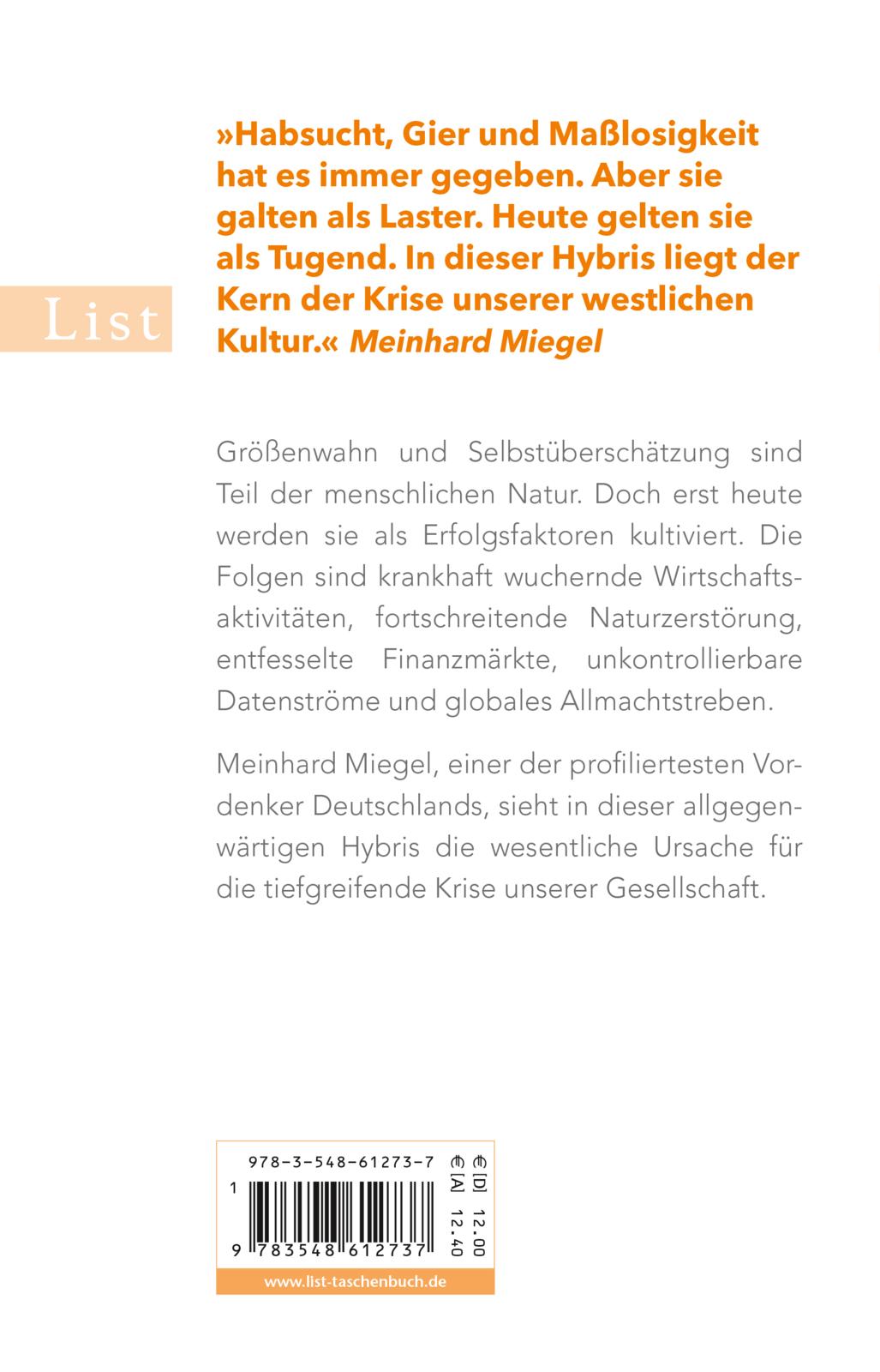 Größenwahn und Selbstüberschätzung sind Teil der menschlichen Natur. Doch erst heute werden sie als Erfolgsfaktoren kultiviert. Die Folgen sind krankhaft wuchernde Wirtschaftsaktivitäten, entfesselte Finanzmärkte, dysfunktionale Bildungs- und Infrastrukturen, aus dem Ruder laufende Großprojekte, unkontrollierbare Datenmengen und globales Allmachtstreben. Meinhard Miegel, einer der profiliertesten Vordenker Deutschlands, sieht in dieser allgegenwärtigen Hybris die wesentliche Ursache für die tiefgreifende Krise von Politik, Wirtschaft und Gesellschaft.