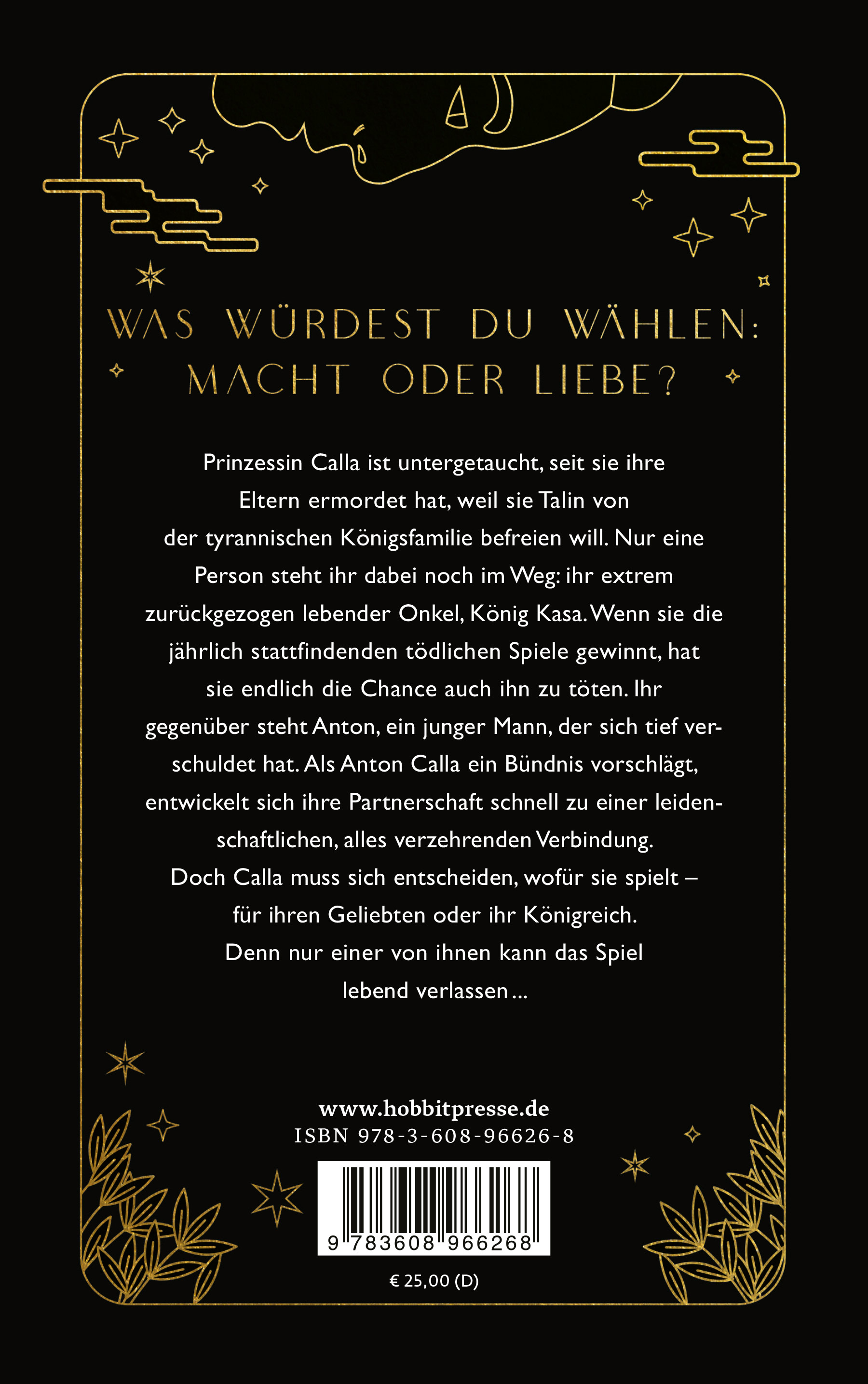 Prinzessin Calla ist untergetaucht, seit sie ihre Eltern ermordet hat, weil sie das Volk von Talin von der tyrannischen Königsfamilie befreien will. Nur eine Person steht ihr dabei noch im Weg: ihr extrem zurückgezogen lebender Onkel, König Kasa. Wenn sie die Spiele gewinnt, hat sie endlich die Chance, ihm nahe genug zu kommen, um ihn zu töten. Ihr gegenüber steht Anton, ein junger Mann, der sich tief verschuldet hat. Die Spiele zu gewinnen ist seine letzte Chance, seine im Koma liegende Jugendliebe und sich selbst vor seinen Schuldnern zu retten. Als Anton Calla ein unerwartetes Bündnis vorschlägt, entwickelt sich ihre Partnerschaft schnell zu einer leidenschaftlichen, alles verzehrenden Verbindung. Doch bevor die Spiele enden, muss Calla sich entscheiden, wofür sie spielt – für ihren Geliebten oder ihr Königreich. Denn egal was passiert, nur einer von ihnen kann das Spiel lebend verlassen...