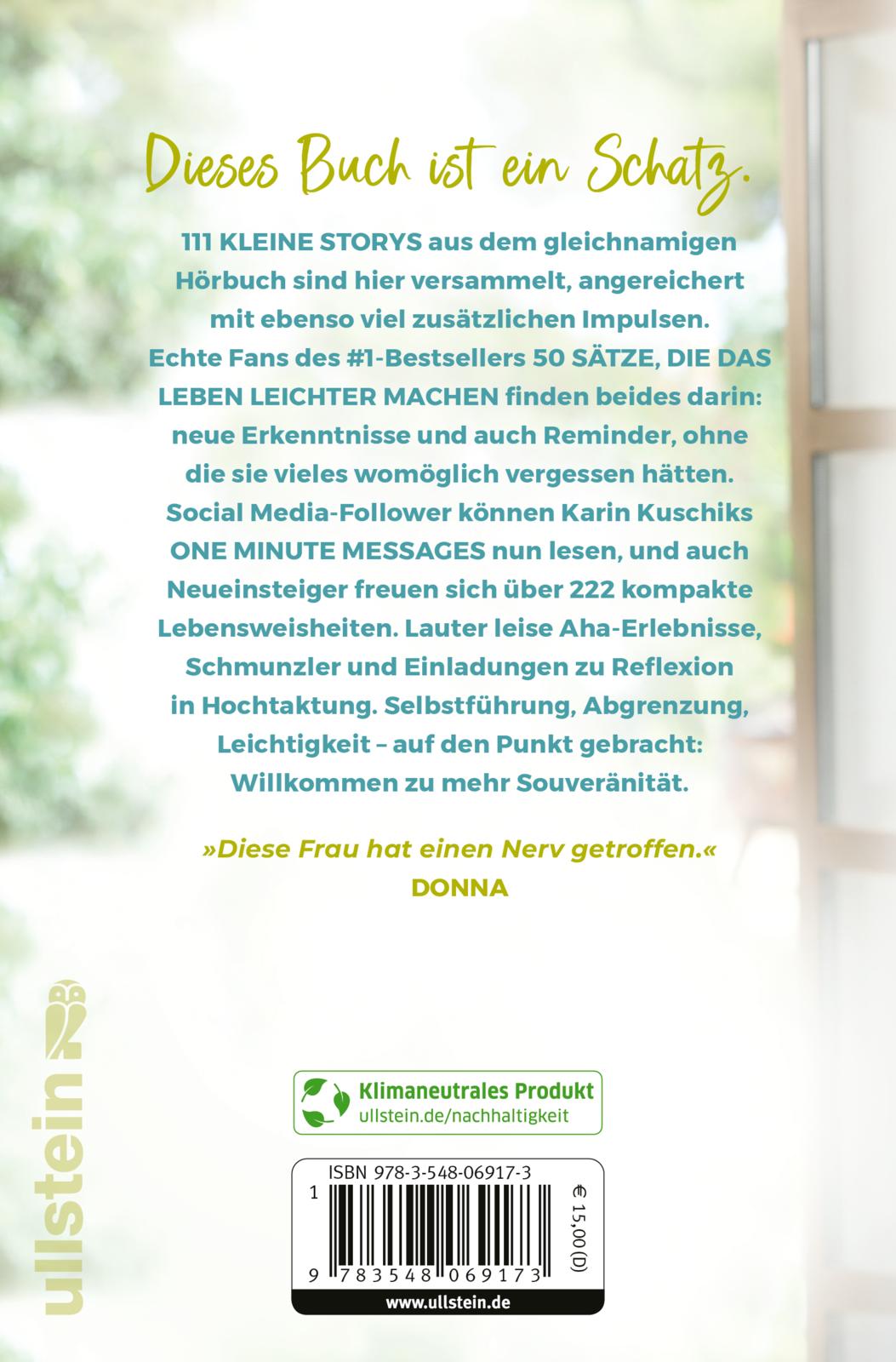 Dieses Buch ist ein Schatz. 111 Kleine Storys aus dem gleichnamigen Hörbuch sind hier versammelt, angereichert mit ebenso viel zusätzlichen Impulsen. Echte Fans des #1-Bestsellers 50 Sätze, die das Leben leichter machen finden beides darin: neue Erkenntnisse und auch Reminder, ohne die sie vieles womöglich vergessen hätten. Social Media-Follower können Karin Kuschiks One Minute Messages nun lesen, und auch Neueinsteiger freuen sich über 222 kompakte Lebensweisheiten, lauter leise Aha-Erlebnisse, Schmunzler und Einladungen zu Reflexion in Hochtaktung. Selbstführung, Abgrenzung, Leichtigkeit – auf den Punkt gebracht: Willkommen zu mehr Souveränität.