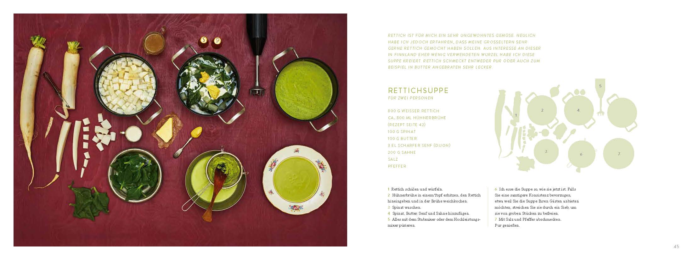 Das Auge isst ja bekanntlich mit. Die finnische Fotografin Marina Ekroos geht sogar noch einen Schritt weiter: Bei ihr kocht das Auge mit! Für ihr erstes Kochbuch beschreitet sie neue Wege der Foodfotografie: Von den Zutaten bis zum fertigen Gericht ist jeder Schritt nachvollziehbar auf einem gemeinsamen Bild dargestellt.