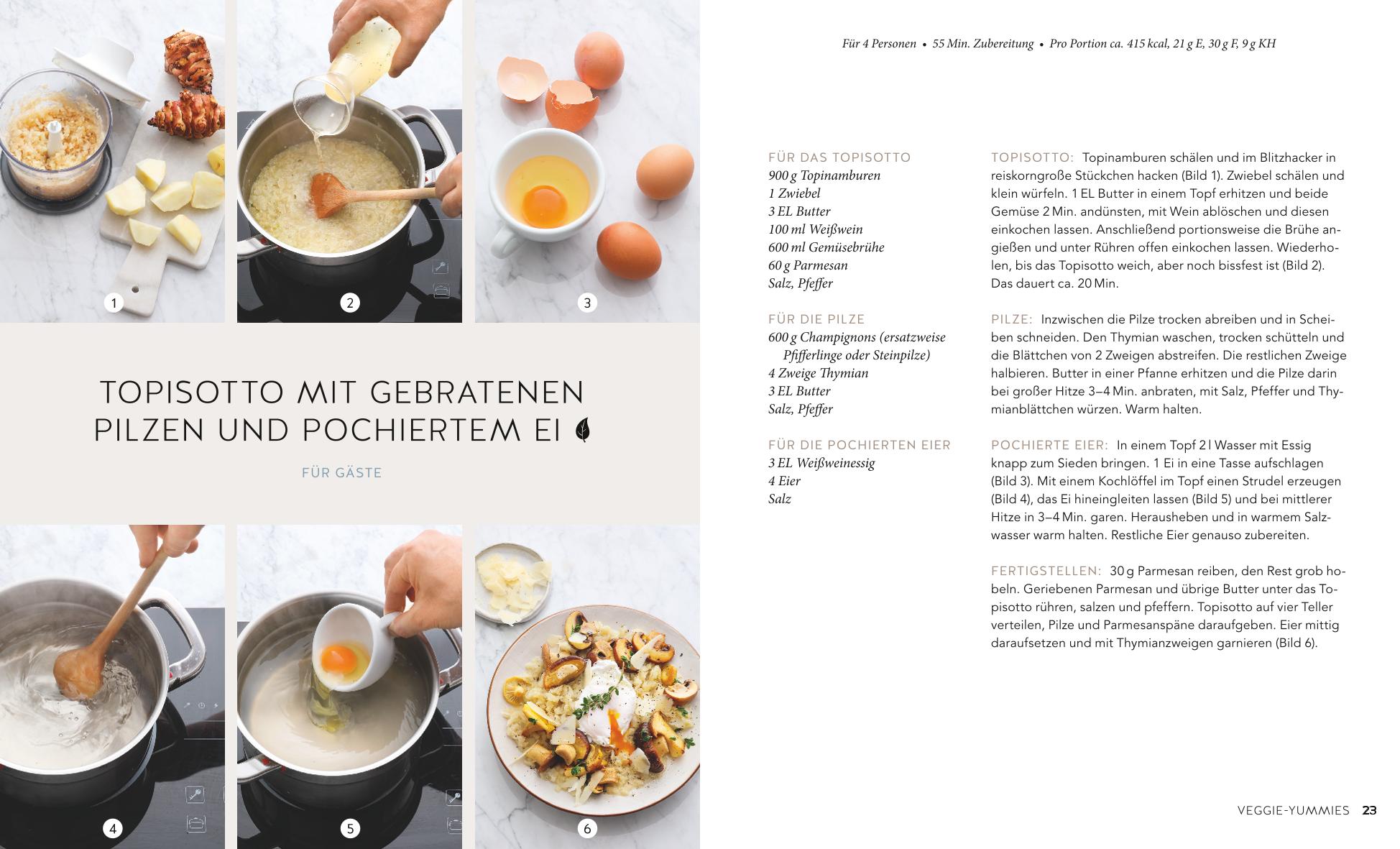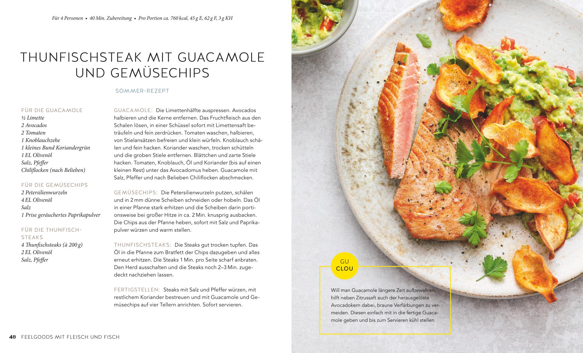 Dann geht es Seite um Seite mit den besten Glücklichmachern weiter. Aus kleinen Stimmungstiefs kommen Sie schnell heraus mit der Asiasuppe Pho-Style mit Gemüsenudeln aus der Kategorie kleine Seelentröster. Wenn es einmal noch mehr Streicheleinheiten für die Seele sein müssen, die sich aber nicht auf der Waage niederschlagen sollen, bringen Veggie-Yummies wie Low-Carb-Pizza mit Auberginen und Feta oder Ofengemüse mit Ziegenfrischkäse-Dip und Feelgoods mit Fleisch und Fisch wie Süßkartoffel-Club-Sandwich, Schnitzel mit Kürbiskernpanade oder Thunfischsteak mit Avocado den gewünschten Wohlfühleffekt.