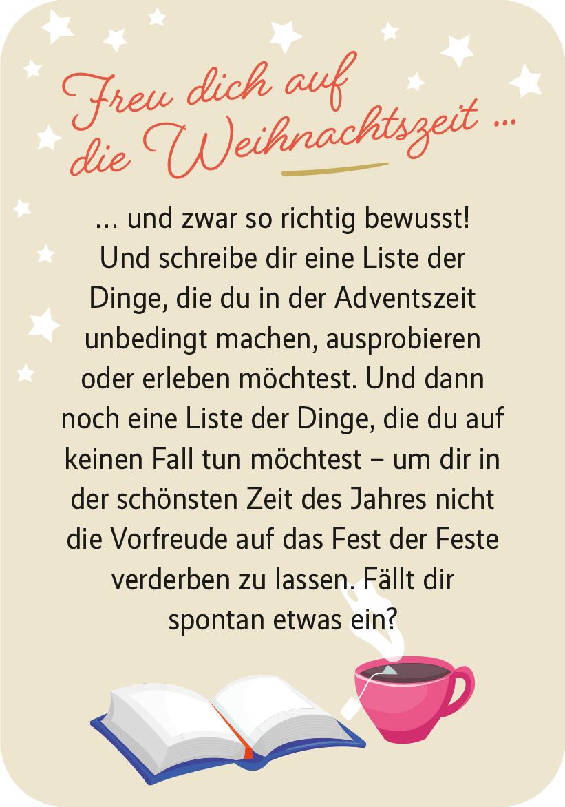 - Beschreibung Ideen für eine abwechslungsreiche Vorweihnachtszeit – kleine Abenteuer im Advent Jeden Tag eine neue Inspiration für ein kleines Alltagsabenteuer – so kommst du gut gelaunt durch die Vorweihnachtszeit! Diese interaktive Adventskalender-Box ist perfekt für alle, die die Vorfreude aufs schönste Fest des Jahres durch kleine, charmante Aktionen besonders steigern und nicht in die alljährliche Alle-Jahre-wieder-Monotonie verfallen wollen. Denn die kleinen Abenteuerkärtchen bieten ganz viel Abwechslung! Jeden Tag eine überraschende Idee ganz einfach in den Alltag einbinden und sich freuen. Die ungewöhnlichen und weihnachtlich-netten Aktionen und Inspirationen machen nicht nur gute Laune, sondern beleben den Geist der Weihnacht noch ein bisschen stärker als sonst. Perfekt als kleines Mitbringsel oder Geschenk für Mama, Papa, Freundin, Partner und alle, die man gernhat und denen man schon vor dem eigentlichen Fest alles Liebe sagen möchte. Überraschungseffekt gegen Weihnachtsmonotonie: 24 Karten mit tollen Aktionsideen, die ganz einfach umzusetzen und in den Alltag integrierbar sindToller Zusatznutzen: Die Kartenrückseiten sind mit großen Ziffern bedruckt und eignen sich auch perfekt zur Nummerierung für selbst gebastelte Adventskalender Schön verstaut: In der kleinen Box sind die Karten immer gut geschützt und stets einsatzbereitSchenken leicht gemacht: Die weihnachtlich gestaltete Box ist zugleich eine schöne Verpackung – einfach Schleifenband herumbinden und verschenkenIdeales Geschenk oder Mitbringsel: Für Nachbarn, Schwester, Lieblingskollegin oder alle anderen, die den Advent bewusst erleben möchtenKärtchen aufdecken und … los geht‘sEine tolle Adventskalender-Idee! Die schöne Kartenbox mit den 24 Mikroabenteuern im Advent ist das ideale Mitbringsel für alle, die sich so richtig in Weihnachtsstimmung versetzen lassen wollen. Für mehr Inspiration im alljährlichen Weihnachtstrubel!