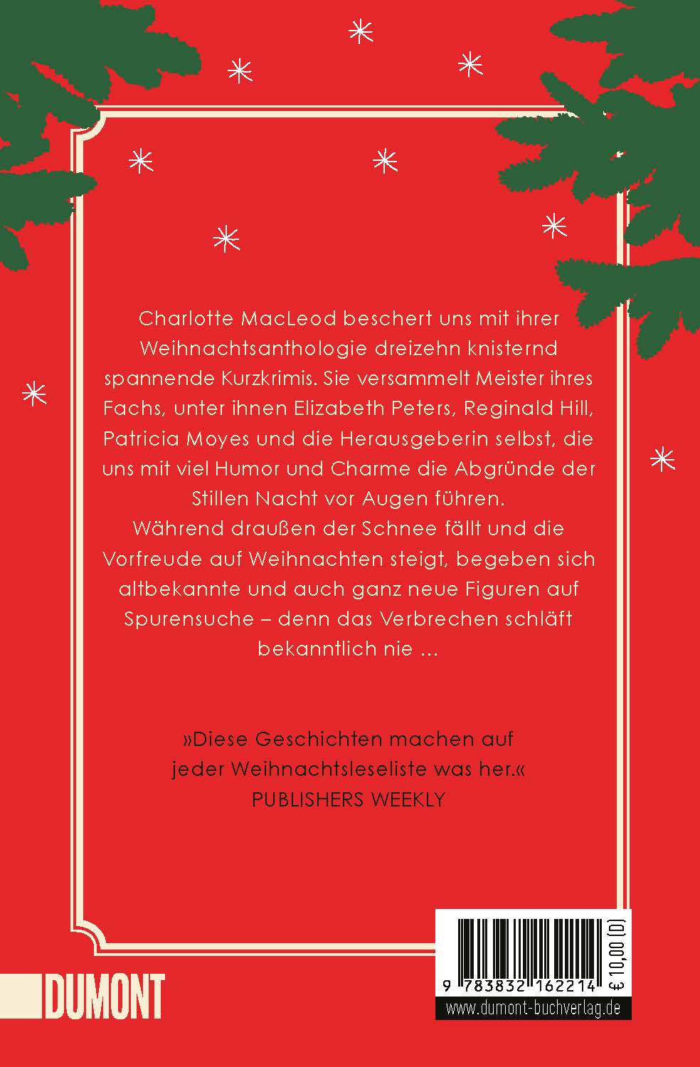 Charlotte MacLeod beschert uns mit ihrer Weihnachtsanthologie einen ganzen Sack voll knisternd spannender Kurzkrimis. Sie versammelt dreizehn Meister ihres Fachs, unter ihnen Elizabeth Peters, Dorothy J. Cannell, Reginald Hill, Eric Wright, Margaret Maron, Patricia Moyes und die Herausgeberin selbst, die uns mit viel Humor und Charme die Abgründe der Stillen Nacht vor Augen führen. Während draußen der Schnee fällt und die Vorfreude auf Weihnachten steigt, begeben sich altbekannte und auch ganz neue Figuren auf Spurensuche – denn das Verbrechen schläft bekanntlich nie. Lehnen Sie sich mit einer Tasse Tee zurück und lassen Sie sich entführen: Auch an den unscheinbarsten Orten bergen die langen Nächte der Adventszeit schaurige Geheimnisse …