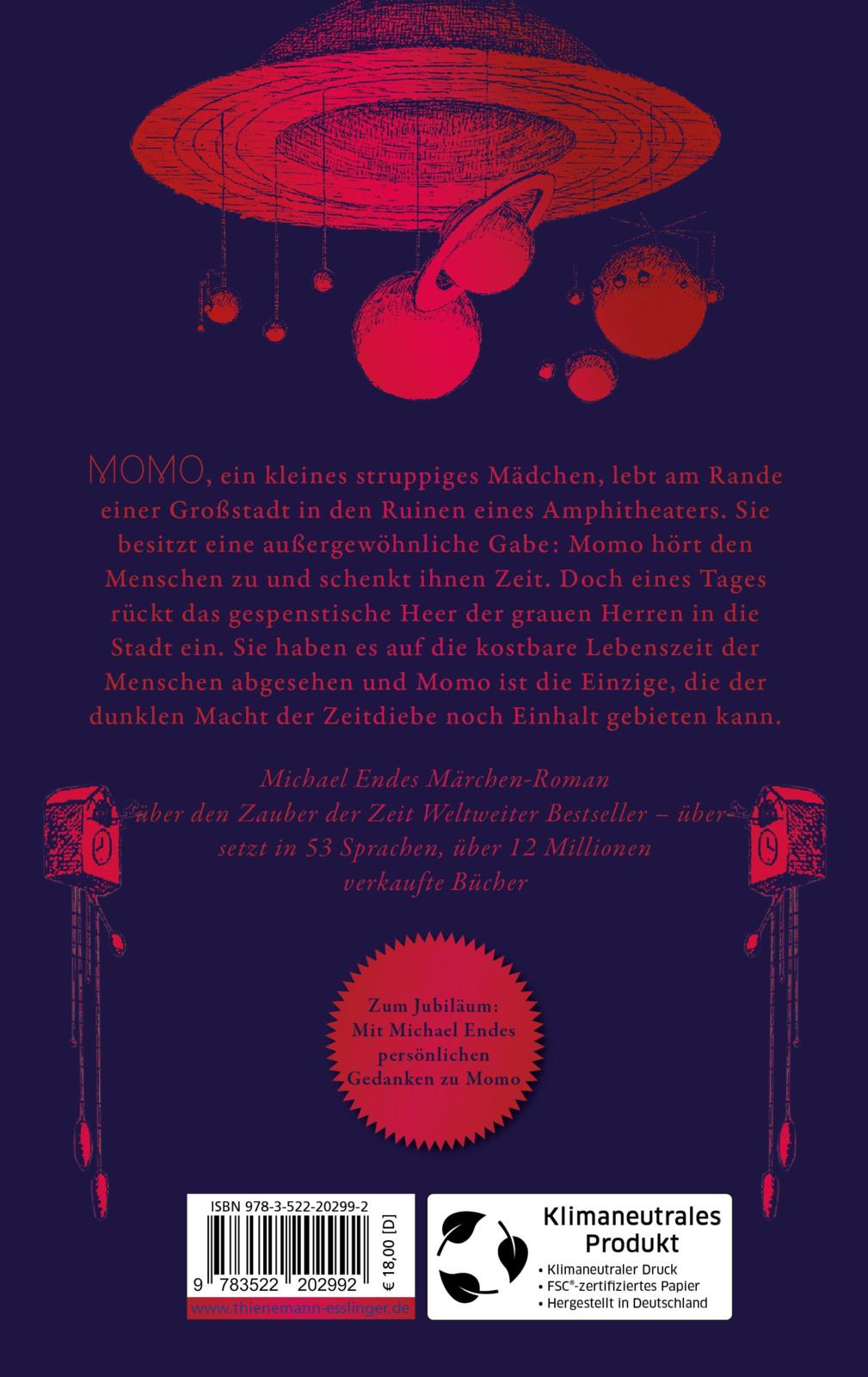 - Beschreibung Momo, ein kleines struppiges Mädchen, lebt am Rande einer Großstadt in den Ruinen eines Amphitheaters. Sie besitzt eine außergewöhnliche Gabe: Momo hört den Menschen zu und schenkt ihnen Zeit. Doch eines Tages rückt das gespenstische Heer der grauen Herren in die Stadt ein. Sie haben es auf die kostbare Lebenszeit der Menschen abgesehen und Momo ist die Einzige, die der dunklen Macht der Zeitdiebe noch Einhalt gebieten kann.Michael Endes Märchen-Roman über den Zauber der Zeit mit überraschenden zusätzlichen Texten, die tief in die Gedankenwelt des Autors blicken lassen. So wird die Lektüre des Klassikers zu einem neuen Erlebnis!