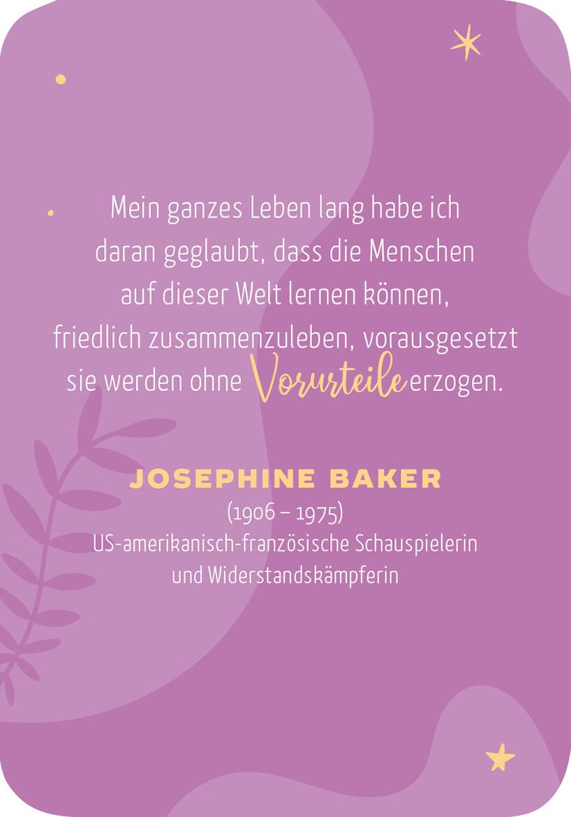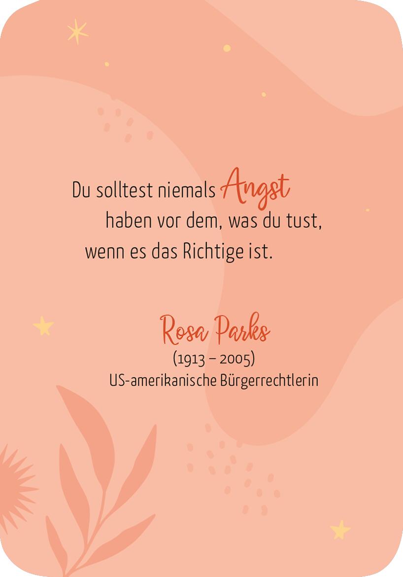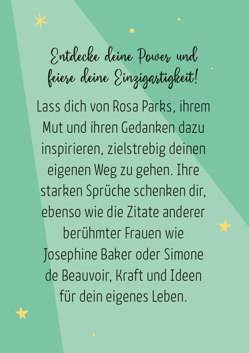 Rosa Parks kann uns auch heute dazu inspirieren, selbstbewusst unseren eigenen Weg zu gehen. Nicht nur ihr Werdegang, auch viele ihrer Zitate sind legendär – und ebenso die starken Sprüche anderer einzigartiger Frauen wie Josephine Baker, Ella Fitzgerald oder Simone de Beauvoir, die mit vielen weiteren in dieser wunderschön gestalteten Box versammelt sind. Lass dich motivieren von großen Gedanken berühmter Frauen und gewinne aus ihnen Kraft und Ideen für dein eigenes Leben!