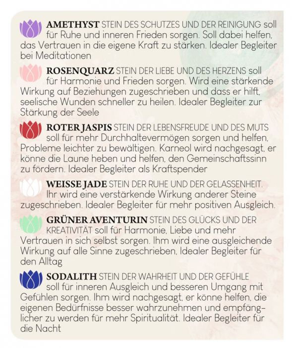 - Beschreibung Edelsteine sind kraftvolle Begleiter im Alltag und können helfen, die innere Balance zu stärken. Ob Rosenquarz, Jade oder Amethyst – Jeder Kraftstein hat eine andere Bedeutung, die in einem kleinen Heftchen erklärt wird. Insgesamt sind bei uns sechs verschiedenen Halbedelsteine verfügbar: Amethyst, Rosenquarz, Aventurin, Jaspis, Jade und Sodalith. So wird dem Rosenquarz eine stärkende Wirkung auf Beziehungen zugeschrieben. Als Handschmeichler bei sich getragen wird aus dem Kraftstein ein toller Glücksbringer für alle Lebenslagen. Besonders schön ist die edle Goldgravur, mit der jeder Stein individuell verziert ist. Verpackt in einem zarten Organza-Beutelchen wird aus dem Kraftstein ein schönes Mitbringsel für einen lieben Menschen, dem Sie eine Portion Glück und Lebensfreude schenken möchten.6 Halbedelsteine verfügbar:Amethyst (Stein des Schutzes und der Reinigung)Rosenquarz (Stein der Liebe und des Herzens)Roter Jaspis (Stein der Lebensfreude undd des Muts)Weiße Jade (Stein der Ruhe und der Gelassenheit)Grüner Aventurin (Stein des Glücks und der Kreativität)Sodalith (Stein der Wahrheit und der Gefühle)mit edler Goldgravurim Organza-BeutelchenHinweis: Motiv wird zufällig gewählt. Wünsche nicht möglich.