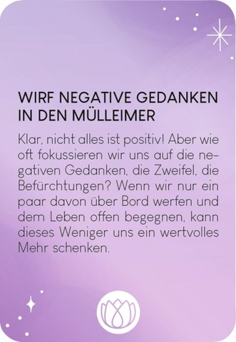 - Beschreibung Selfcare to go: In diesen Kartensets warten Inspirationen und Impulse für die neue Achtsamkeit im Alltag: Die liebevoll illustrierten Karten helfen dabei, der Hektik des Alltags zu entkommen, den Augenblick zu genießen und die kleinen Dinge des Lebens positiv wahrzunehmen. Less is more: Finde mehr Leichtigkeit im Leben! Minimalismus, bewusster Konsum und weniger Stress sind heute in aller Munde. Was braucht man, um wirklich glücklich zu sein? Diese 50 wunderschön Karten laden dazu ein, mehr „weniger“ im Leben zuzulassen. Für mehr Leichtigkeit, Ausgeglichenheit und Entschleunigung. Also, weg mit dem Ballast und her mit Ordnung, Freiheit und Positivität.
