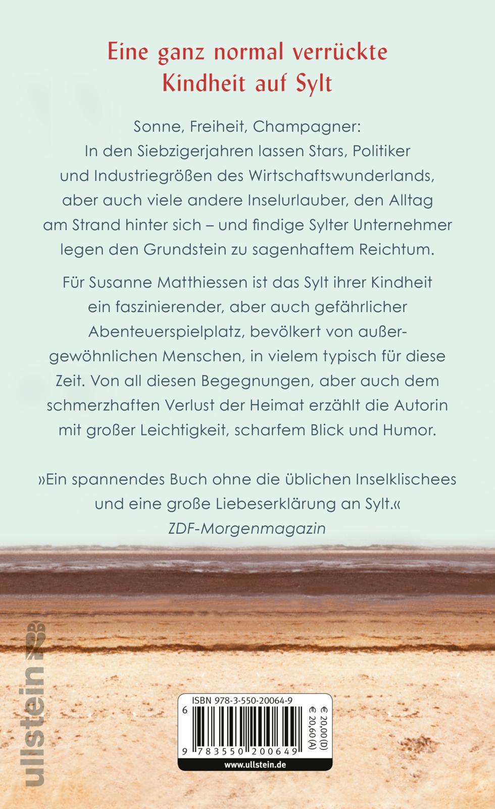 Für Susanne Matthiessen ist das Sylt ihrer Kindheit ein faszinierender, aber auch gefährlicher Abenteuerspielplatz, bevölkert von außergewöhnlichen Menschen, in vielem typisch für diese Zeit. Von all diesen Begegnungen, aber auch dem schmerzhaften Verlust der Heimat erzählt die Autorin mit großer Leichtigkeit, scharfem Blick und Humor.