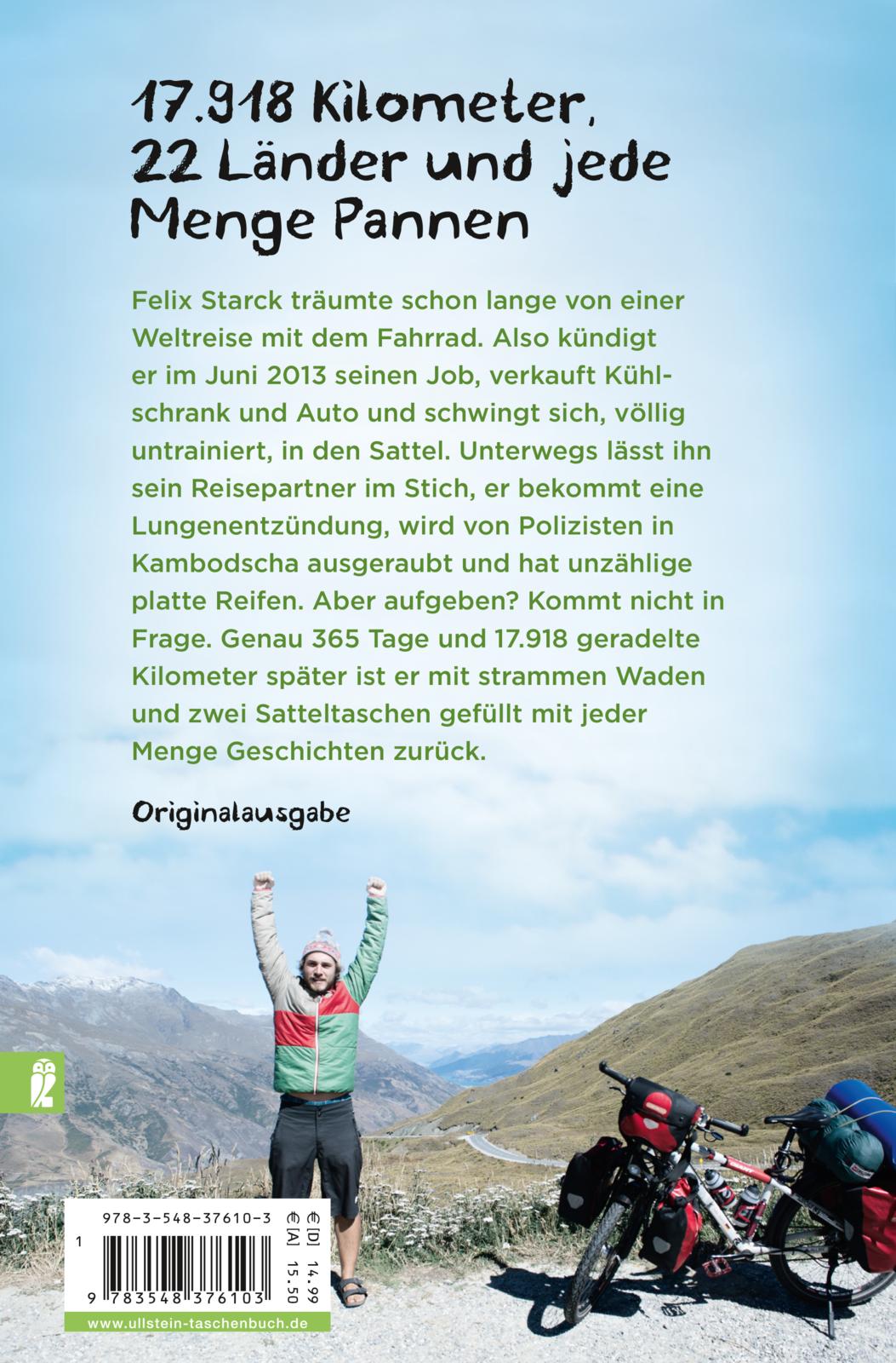 Felix Starck träumte schon lange von einer Weltreise mit dem Fahrrad. Also kündigt er seinen Job, verkauft Kühlschrank und Auto und schwingt sich, völlig untrainiert, in den Sattel. Unterwegs lässt ihn sein Reisepartner im Stich, er bekommt eine Lungenentzündung, wird von Polizisten in Kambodscha ausgeraubt und hat unzählige platte Reifen. Aber aufgeben? Kommt nicht in Frage. Genau 365 Tage und 17.918 geradelte Kilometer später ist er überraschend wohlbehalten und mit strammen Waden wieder zurück. In seinem Buch erzählt er von einer Reise, wie es sie kein zweites Mal gegeben hat.