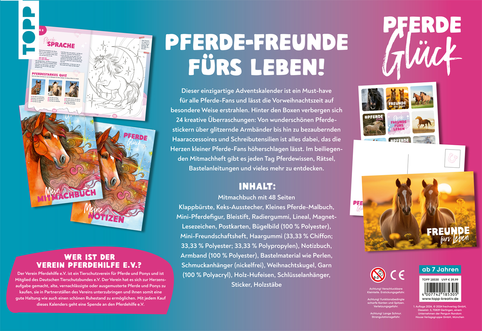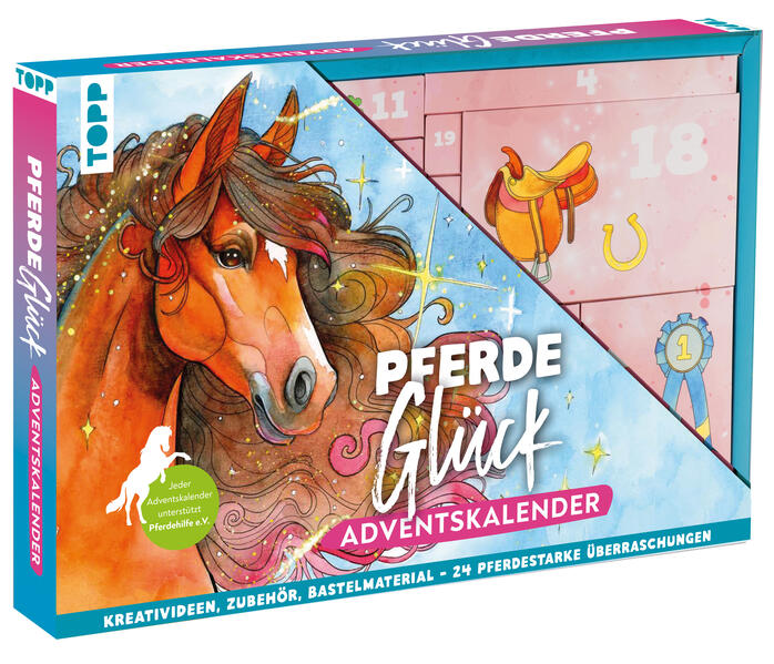 - Beschreibung Jeder Adventskalender unterstützt den Verein Pferdehilfe e.V.!Dieser einzigartige Adventskalender ist ein Must-have für alle Pferde-Fans und lässt die Vorweihnachtszeit auf besondere Weise erstrahlen. Hinter den Boxen verbergen sich 24 kreative Überraschungen: Von wunderschönen Pferdestickern über glitzernde Armbänder bis hin zu bezaubernden Haaraccessoires und Schreibutensilien ist alles dabei, was die Herzen kleiner Pferde-Fans höherschlagen lässt. Im beiliegenden Mitmachheft gibt es jeden Tag Pferdewissen, Rätsel, Bastelanleitungen und vieles mehr zu entdecken. ACHTUNG SPOILER!Das erwartet dich:Mitmachbuch mit 48 SeitenKleines Pferde-MalbuchMini-PferdefigurNotizbuchPostkartenBügelbild (100 % Polyester)Mini-FreundschaftsheftKlappbürsteKeks-AusstecherHaargummi (33 % Chiffonn; 33 % Polyester; 33% Polypropylene)Armband (100 % Polyester)StickerSchreibutensilien: u.a. Bleistift, Radiergummi, Lineal, Magnet-LesezeichenBastelmaterial: u.a. Perlen, Schmuckanhänger (nickelfrei), Weihnachtskugel, Garn (100 % Polyacryl), Holz-Hufeisen, Schlüsselanhänger, HolzstäbeÜber Pferdehilfe e.V.Der Verein Pferdehilfe e.V. ist ein Tierschutzverein für Pferde und Ponys und ist Mitglied des Deutschen Tierschutzbundes e.V. Der Verein hat es sich zur Herzensaufgabe gemacht, alte, vernachlässigte oder ausgemusterte Pferde und Ponys zu kaufen, sie in Partnerställen des Vereins unterzubringen und ihnen somit eine gute Haltung wie auch einen schönen Ruhestand zu ermöglichen. Mit dem Kalender unterstützt du diesen engagierten Verein.