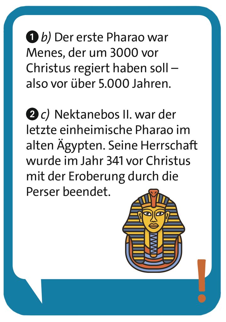 - Beschreibung Wie konnten Forschende die Hieroglyphen entschlüsseln? Und wozu haben die Menschen damals die Pyramiden gebaut? 100 spannende Fragen und Fakten rund ums alte Ägypten warten in diesem neuen Pocket Quiz junior. Egal ob im Team oder allein, der pfiffige Rätselspaß eignet sich für Kinder ab 8 Jahren. Durch das handliche Format können kleine Ratefüchse jederzeit unterwegs oder auch zu Hause ihr Wissen unter Beweis stellen. Jetzt gibt es unseren Klassiker auch endlich für die junge Generation! Das Pocket Quiz junior bietet spannende Inhalte für Kinder, mit denen sich jede Wartezeit perfekt überbrücken lässt. Ellenlange, langweilige Autofahrten? Warten an der Bushaltestelle nach der Schule? Die Kinderquizze sorgen dank interessanter Themen, kniffligen Fragen und modernem Design für die nötige Ablenkung und lassen die Zeit wie im Flug vergehen. Jedes Quiz besteht aus 50 Karten, pickepackevoll mit abwechslungsreichen, kniffligen Quizfragen, Rätseln, Knobeleien und Denksportaufgaben. Dank der attraktiven Geschenkverpackung im Mitnahmeformat ist das Pocket Quiz Junior das perfekte Mitbringsel zum Geburtstag auch für zwischendurch. Zu kompaktem Wissen für unterwegs kann doch niemand nein sagen. So wird’s gespielt: Feste Spielregeln gibt es keine. Man kann die Fragen alleine beantworten und die Lösung auf der Rückseite der Karte kontrollieren. Oder man spielt im Team und stellt sich die Fragen gegenseitig. + 50 Karten in einer Schachtel+ 100 Fragen über Pyramiden, Sagen und Sehenswürdigkeiten+ aus FSC®-zertifiziertem Papier