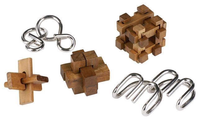 - Inhalt: 3 x Holzpuzzles und 2 x Metallpuzzles