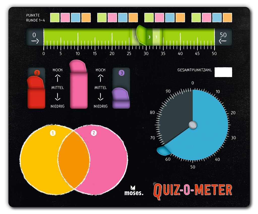 QUIZ-O-METER: Das Schätz-Quiz mit Spannung, Witz und jeder Menge Aha-Momente! Mit 240 abwechslungsreichen Fragen und cleveren Antworttafeln bringt QUIZ-O-METER frischen Schwung an den Spieltisch. In vier Runden voller Überraschungen, Strategien und Bauchgefühl gilt es, Fragen richtig einzuschätzen, die Konkurrenz auszuspielen und möglichst genau ins Schwarze zu treffen. Ob mit Wissen, Intuition oder einem Hauch Bluff – wer den Dreh raushat, punktet! Und wenn es richtig eng wird, sorgt das Stechen für nervenaufreibende Spannung bis zum Schluss. Das ideale Spiel für Familienabende, Partys und alle, die Quizspiele mit dem besonderen Dreh lieben!