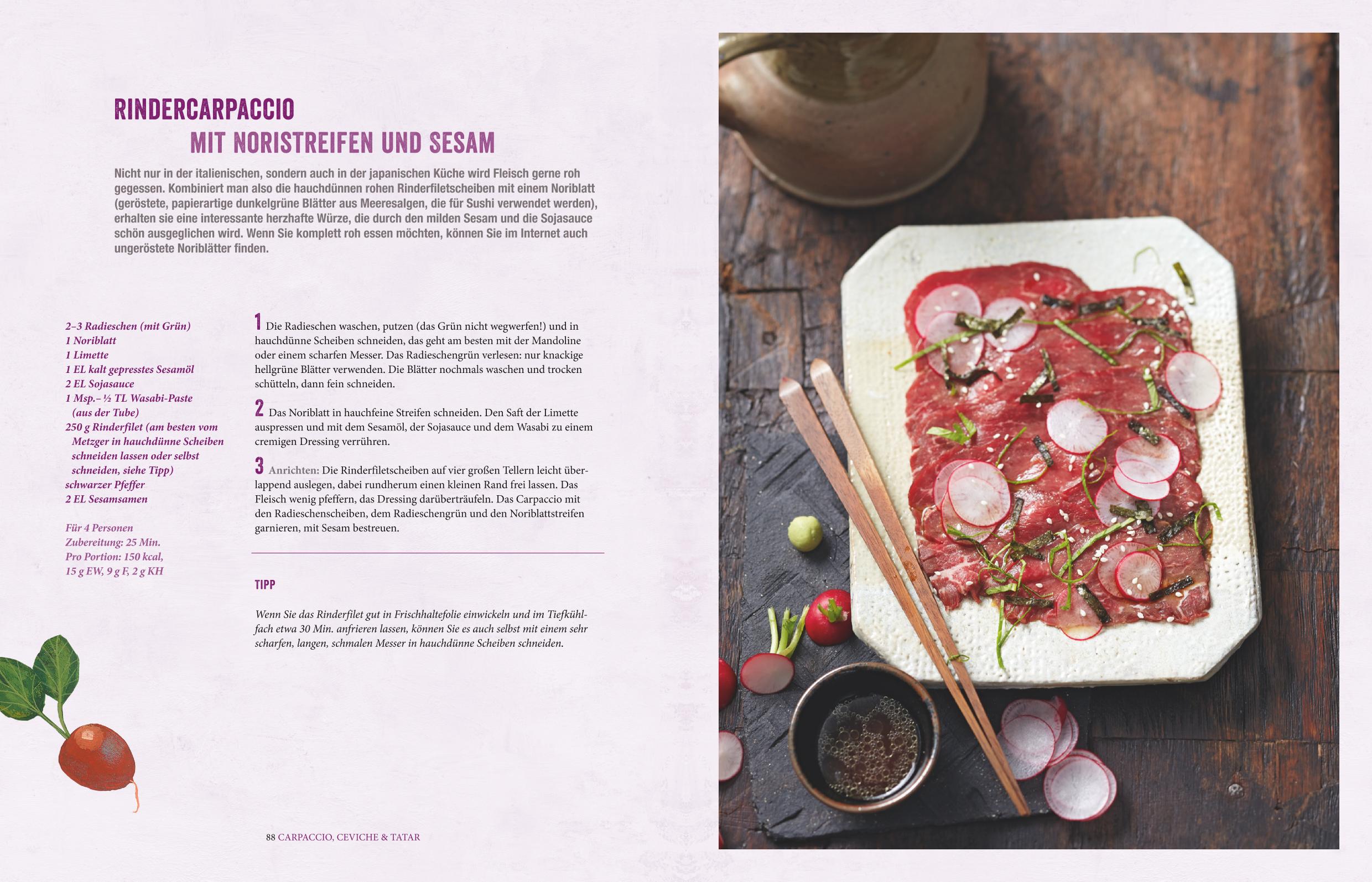 Roh, ist das nicht Rohkostsalat mit Möhren, Äpfeln und Zitronensaft? Braucht man für so etwas wirklich ein Kochbuch, wo es bei Roh doch eigentlich darum geht, nicht zu kochen? Ja! Erstens: Weil Roh und Rohkost zwei ganz verschiedene Dinge sind und es hier zweitens lauter Rezepte für Genießer gibt: Steak Tatar, Zucchini mit Pistazienpesto oder Papayaschiffchen mit Blaubeeren - und natürlich auch Klassiker wie Carpaccio, Ceviche und Smoothies. Das Tolle: Sie alle schmecken nicht nur sensationell, sie sind auch echtes Well-Food! Um sich etwas Gutes zu tun, müssen Sie natürlich nicht ständig roh essen. Zwar begleiten Sie die Rezepte vom Frühstück bis zum Abendessen, aber im Fokus steht vor allem, Ihre Geschmacksnerven zu überraschen. Denn von schönen Überraschungen kann man schließlich nie genug bekommen. Deshalb verraten hier auch vier Profiköche, welches ihre absolut bevorzugten rohen Delikatessen sind. Machen Sie es ihnen nach - der Experimentierlust sind keine Grenzen gesetzt!