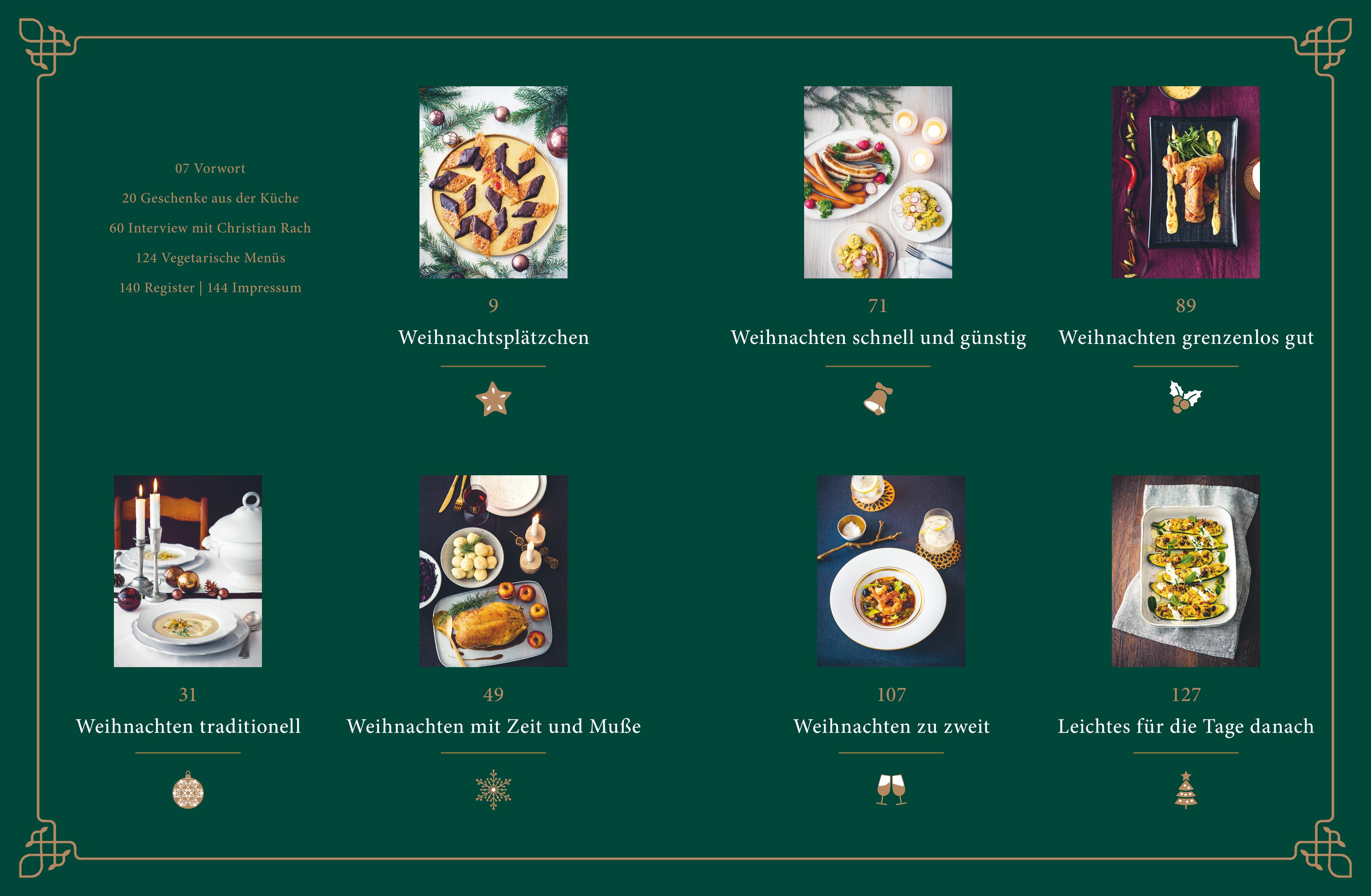 Die 3-Gänge-Menüs überzeugen nicht nur kulinarisch, sie sind auch optisch ein Highlight, wenn Sie mit der ganzen Familie feiern. Mit vielen Praxistipps erklärt Rach, wie Kompliziertes einfach wird und was man vorbereiten kann. Die Arbeitsschritte sind unterteilt auf den Vortag, 2–8 Stunden vor dem Fest und das Servieren. Freuen Sie sich auf folgende Menüs: