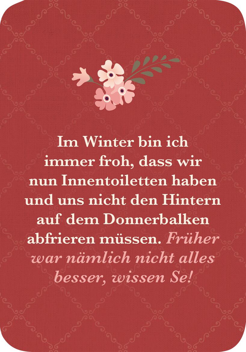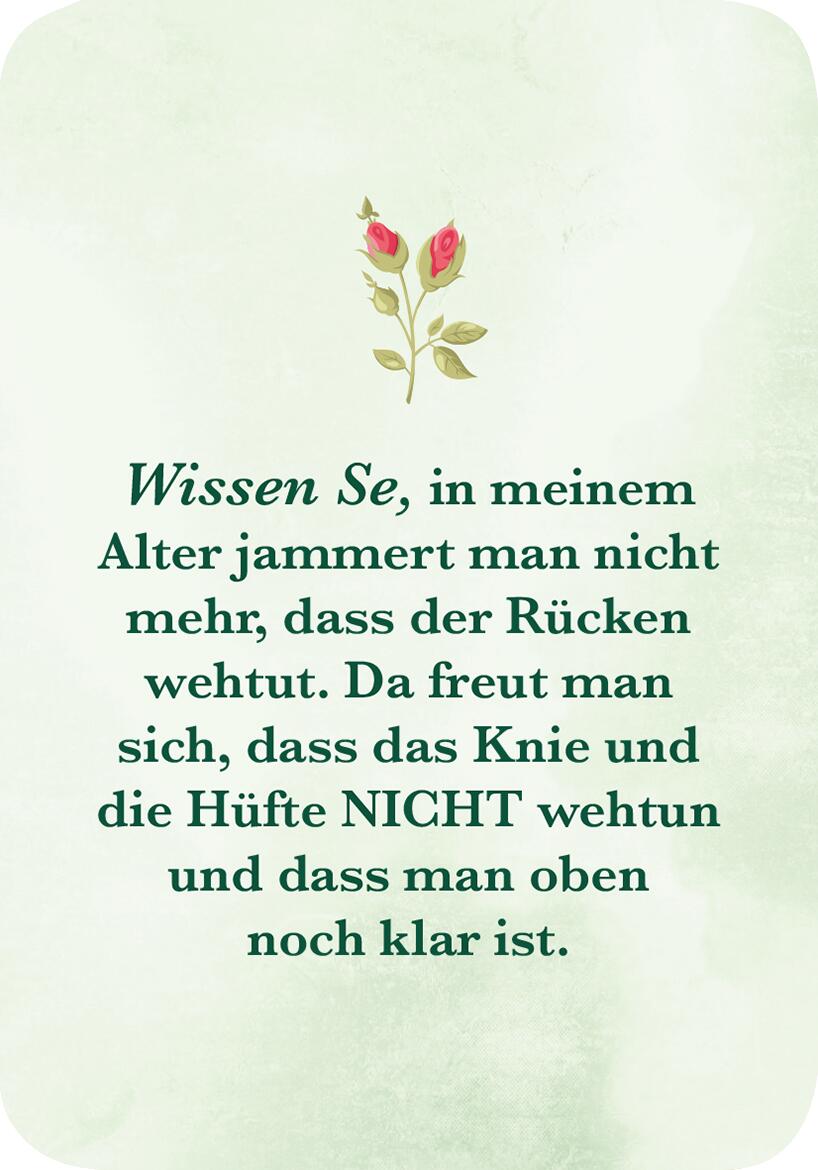In der Kartenbox finden sich jede Menge Ratschläge, die zum Nachdenken anregen, oder flotte Sprüche, die einfach glücklich machen. Ein Must-have für alle Renate-Bergmann-Fans und die, die es noch werden wollen.