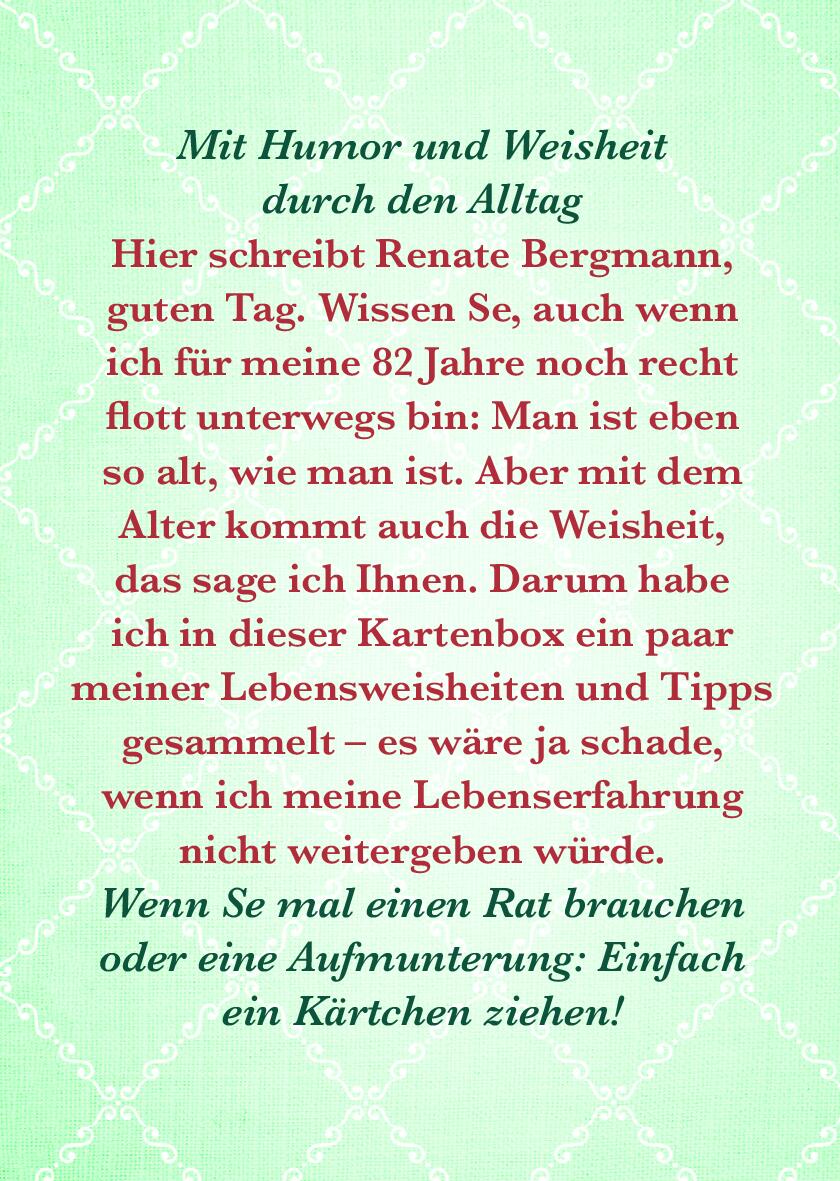 - Zum Schmunzeln und Nachdenken: Lassen Se sich von Renate Bergmann mal erklären, was im Leben wirklich wichtig ist. 50 Kärtchen mit Lebensweisheiten und wertvollen Tipps für jede Lebenslage