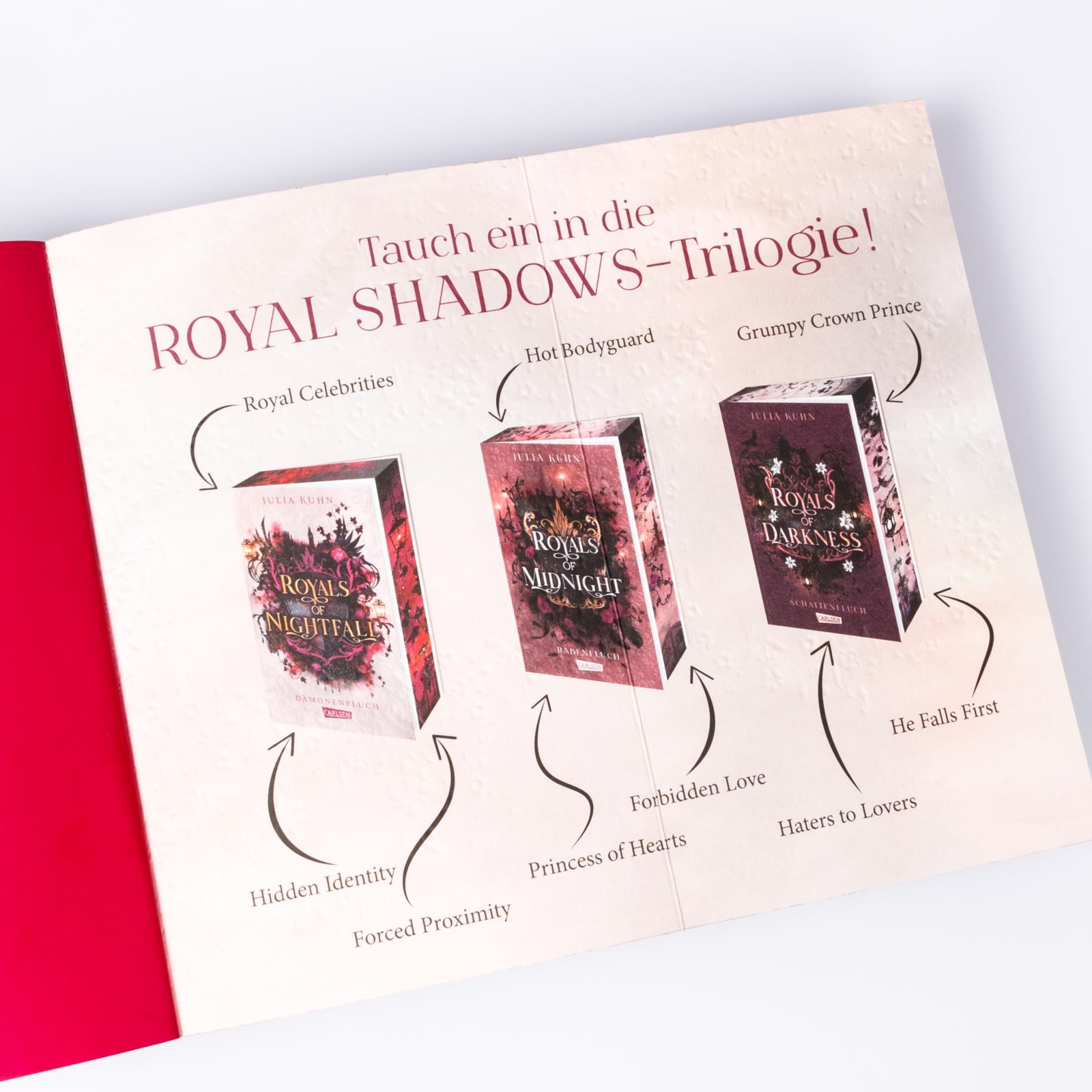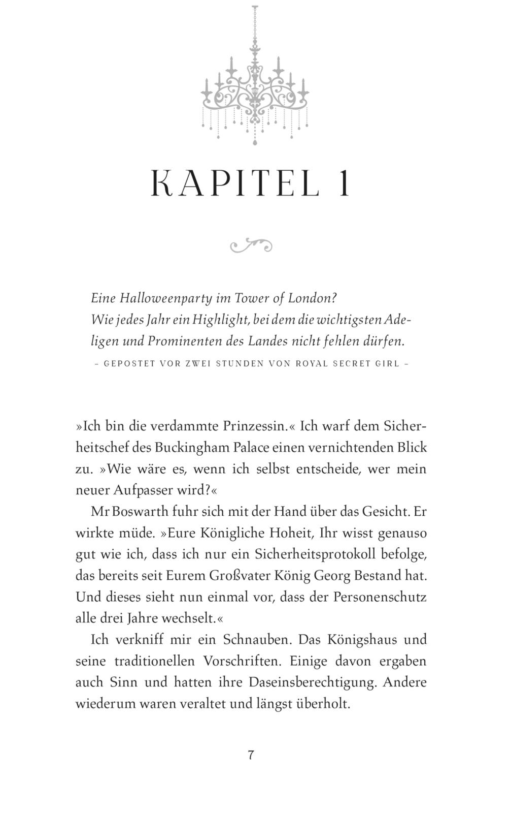 Niemand ist im britischen Königreich so beliebt wie Prinzessin Leonora. Doch während der Stilikone alle Herzen zufliegen, ist ihres heimlich vergeben – nämlich an den Schotten Logan Scott, einen ausgebildeten Royal Guard of Nightfall, nun jedoch Leonoras neuer Bodyguard und damit absolut tabu ... Wie sehr sie ihn an ihrer Seite braucht, merkt sie, als ein Geisterritual an Halloween schiefgeht und in ihren Spiegeln mysteriöse Gestalten auftauchen. Wenig später verschwinden die Raben des Towers und lösen sechs gewaltige Flüche aus. Nun müssen Leonora und Logan zusammenarbeiten und kommen sich gefährlich nahe …