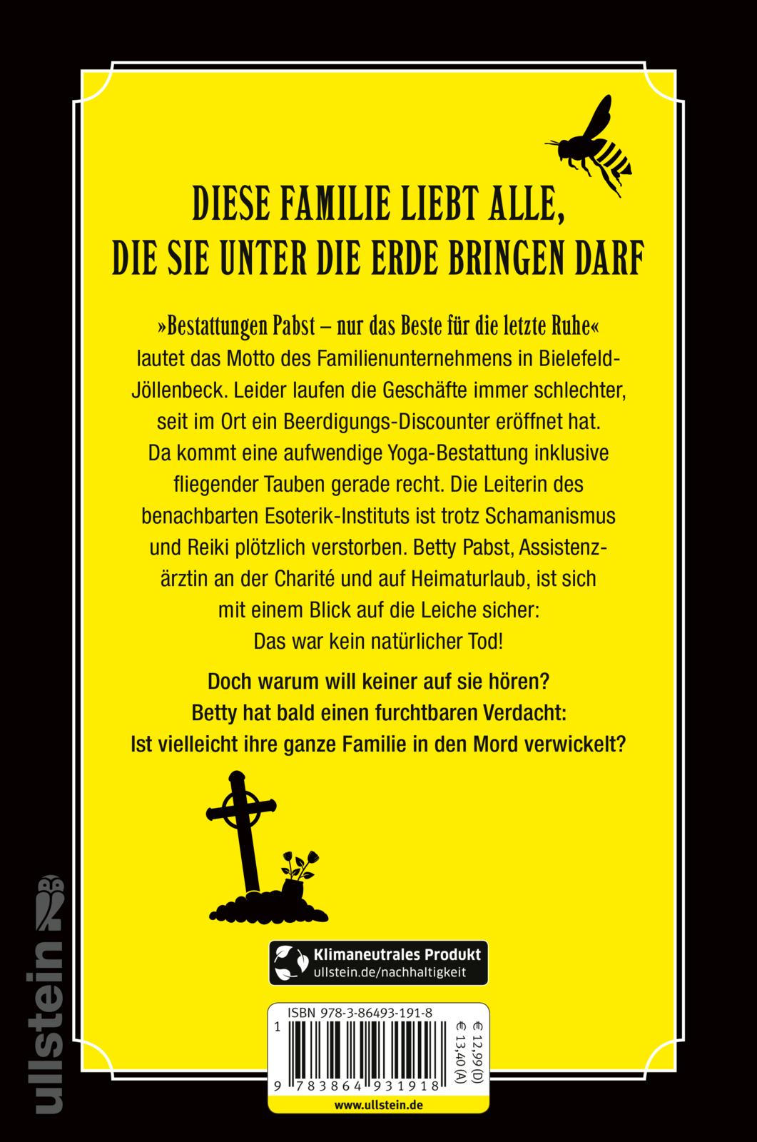 Da kommt ihnen eine aufwendige Yoga-Bestattung inklusive fliegender Tauben gerade recht. Die Leiterin des benachbarten Esoterik-Instituts ist trotz Schamanismus und Reiki plötzlich verstorben. Betty Pabst, Assistenzärztin an der Charité und auf Heimaturlaub, ist sich mit einem Blick auf die Leiche sicher: Das war kein natürlicher Tod!