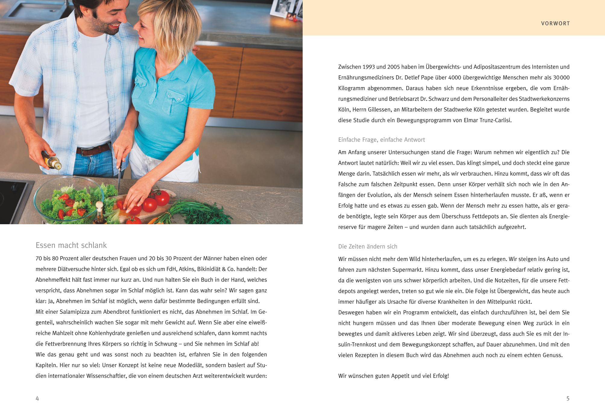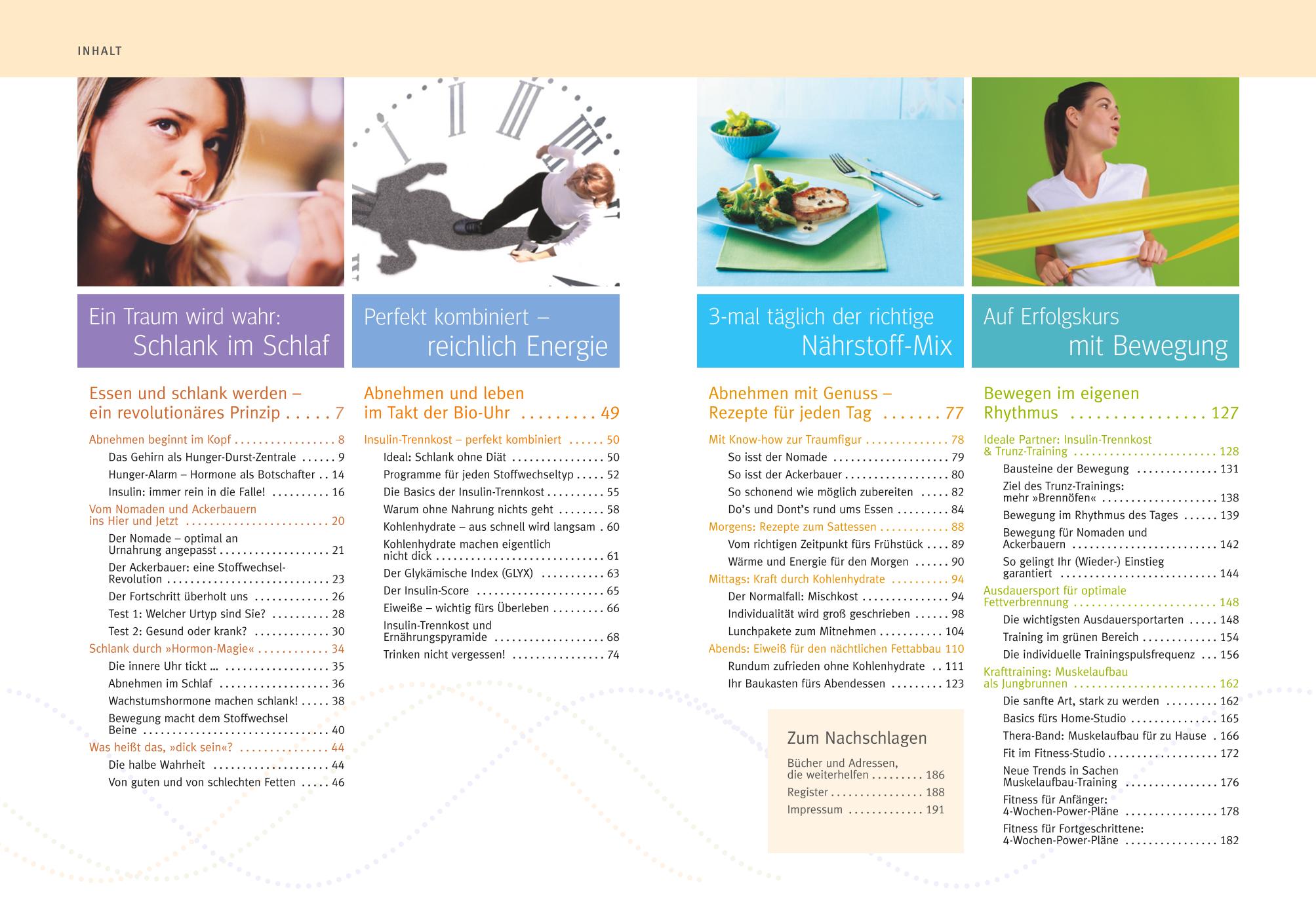Der Schlaf ist die längste Fettverbrennungsphase am Tag. Lernen Sie, diese effektiv für sich zu nutzen. Entscheidend ist, den Körper morgens, mittags und abends jeweils mit dem richtigen Nährstoff-Mix zu versorgen, damit er das bekommt, was er gemäß seinem Biorhythmus optimal verwerten kann. Am Tag sind vor allem Kohlenhydrate als Energiequelle wichtig, um leistungsfähig zu sein. Die Nacht nutzt der Körper zur Erholung und für Reparaturen - eine eiweißreiche Mahlzeit sorgt dafür, dass die Energie dafür aus den Fettzellen kommt. Wer also das Richtige zum richtigen Zeitpunkt isst, macht bald nicht nur im Traum eine gute Figur! Das Buch erklärt, wie man den Einfluss des "Dickmacherhormons" Insulin hemmt und die Schlankmacher-Hormone gezielt aktiviert. Interessante Vorgänge, die sich Tag für Tag im Körper abspielen, werden veranschaulicht. Sattmacher-Rezepte werden ideal kombiniert mit Kraft- und Ausdauertraining für optimale Fettverbrennung.