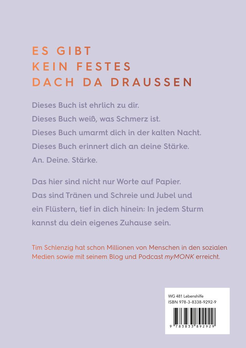 Tim Schlenzig, Gründer von myMONK, führt uns in über 200 kurzen lyrischen Texten durch die Jahreszeiten des Lebens. Mit schonungsloser Offenheit, Verletzbarkeit und Humor beschreibt er, wie sehr doch alles zum Menschsein dazugehört. Das Leichte und das Schwere, die Euphorie und die Krisen, das Verlieben und das Verlieren. Das Dunkle und immer wieder das Aufleuchten neuer Hoffnung.