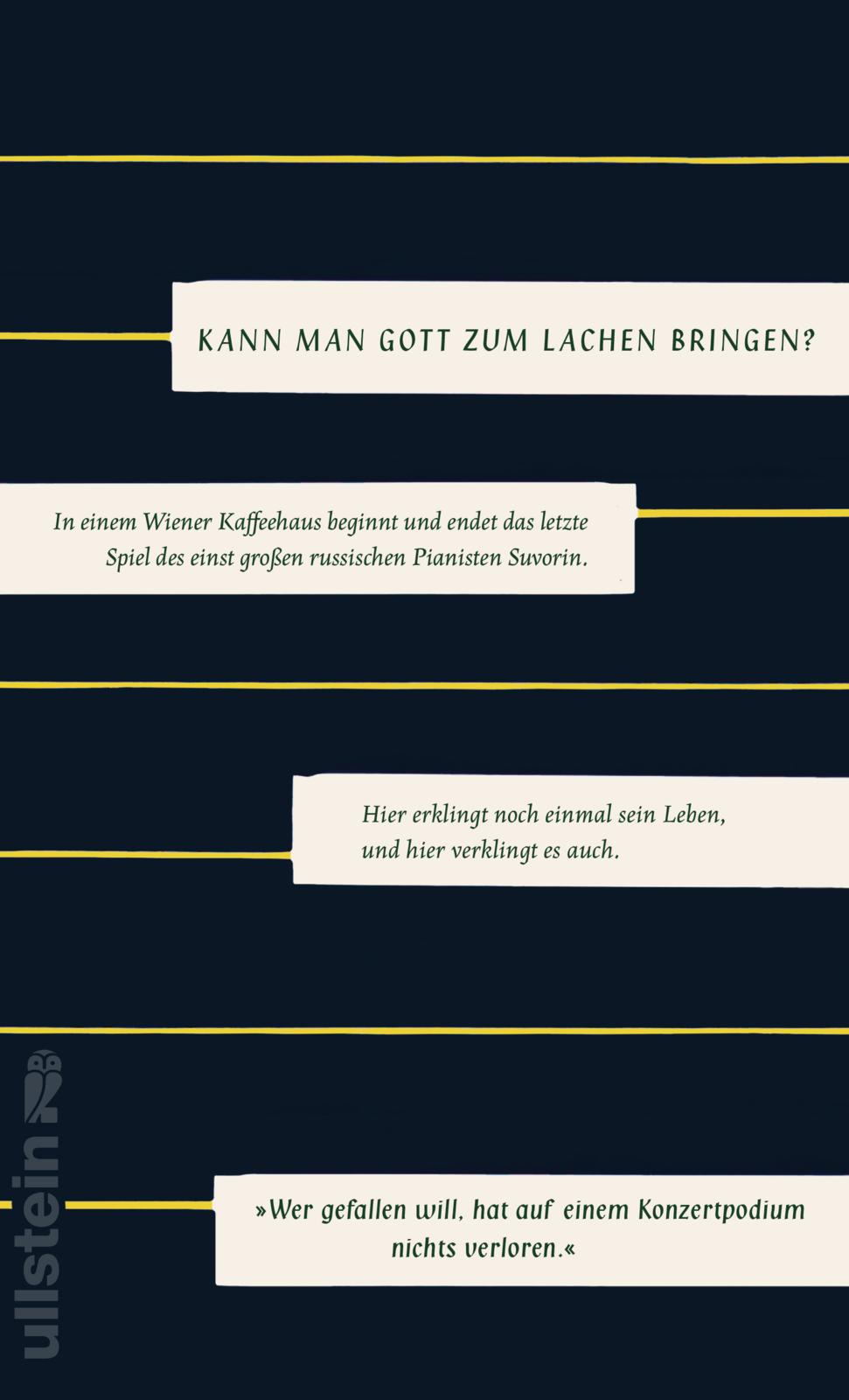 In einem Wiener Kaffeehaus lernt ein Schriftsteller den alten Russen Suvorin kennen. Suvorin war ein erfolgreicher Pianist, doch das ist lange her. Nun steht er am Ende seines Lebens, will seine Geschichte erzählen. Gebannt hört ihm der Schriftsteller zu, denn in Suvorins Schicksal spiegeln sich ein Wille, eine Energie, die ihm vertraut sind. Und immer geht es ums Ganze: um Freiheit und Rebellion, Schönheit und Verfall, um das von der Kunst geschaffene Unvergängliche. Schon bald bekommt die Begegnung der beiden Männer, die zunächst rein zufällig anmutet, etwas Schicksalhaftes. Ein Roman voll schweifender Sehnsucht, Romantik und echtem Leben aus der Feder eines der großen deutschsprachigen Gegenwartsautoren.