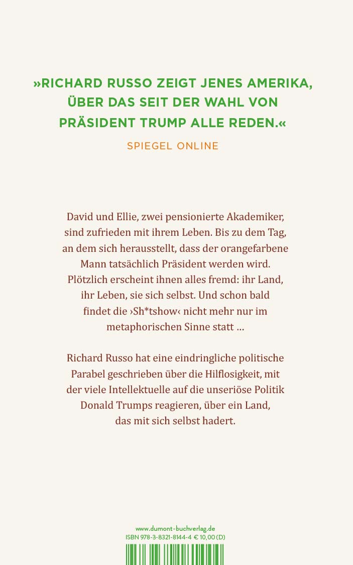Aber dieser spektakulär niederträchtige Akt des Vandalismus ist nur das erste in ei-ner Kette politischer und privater Ereignisse, die sich verheerend auf die eigentlich so behagliche Existenz des Paares auswirken. Richard Russo hat eine eindringliche Parabel geschrieben, in der er von den tiefen, oft unmerklichen Rissen zwischen Freunden, Nachbarn, Familien und selbst Liebenden erzählt, die im Zuge gewichtiger gesellschaftlicher Veränderungen entstehen: Das Politische ist oft privater, als wir meinen.