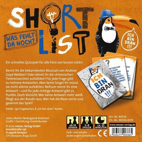 - Beschreibung Für alle Quiz-Junkies und die, die es noch werden wollen, gibt es jetzt „Short List“, ein schnelles Quizspiel für alle Fans von kurzen Listen. Top-Ten-Listen waren gestern. Das neue Zauberwort heißt Short List. Doch was genau verbirgt sich dahinter? Es wird zu unterschiedlichen Themen eine Frage gestellt. Aber es gibt nicht immer nur eine richtige Antwort, sondern gleich eine ganze Liste. Wie viele bekannte Musicals von Andrew Lloyd Webber fallen Ihnen ein? Und können Sie die chinesischen Tierkreiszeichen aufzählen? Keine Sorge, Sie sind bei der Beantwortung der Fragen nicht komplett auf sich alleine gestellt. Reihum nennt jeder eine Antwort und für jede richtige Antwort werden Punkte kassiert. Wem jedoch nichts mehr einfällt, fliegt aus der Runde raus. Wer hat die Nase vorn und gewinnt diesen kurzweiligen Ratespaß? Inhalt: 198 Karten 65 Kristalle 1 Spielanleitung Altersempfehlung: ab 14 Jahren