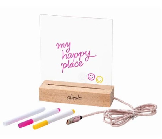 - Beschreibung Transparente LED-Acryl-Tafel mit dekorativem, graviertem Holzsockel+ inklusive 3 abwischbaren Stiften in den Farben Weiß, Rosa und Gelb+ mit verbautem, 1,95 m langem, rosafarbenem USB-A-Textilkabel+ Gestalte die Acryl-Tafel immer wieder neu und sehe, wie die Farben ihre Leuchtkraft entfalten, wenn das Licht an ist+ mit einem weichen Tuch reinigen, damit keine Kratzer entstehen