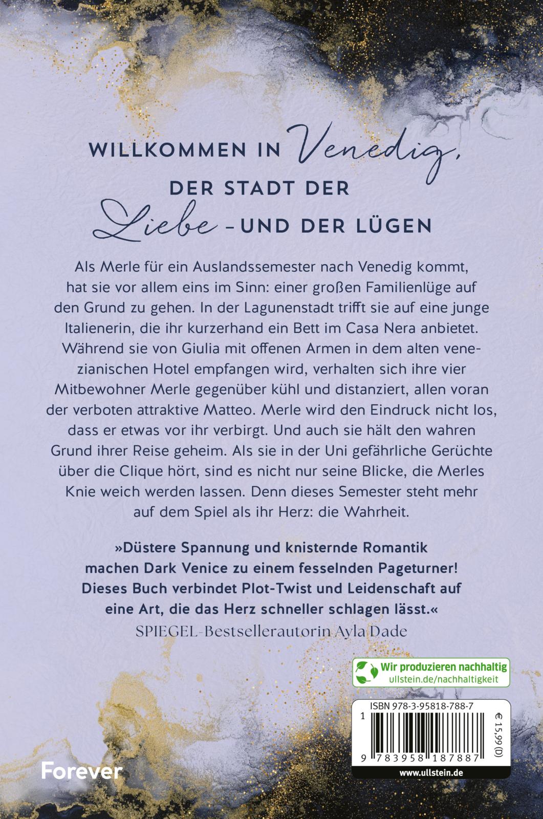 Als Merle für ein Auslandssemester nach Venedig kommt, hat sie vor allem eins im Sinn: einer großen Familienlüge auf den Grund zu gehen. In der Lagunenstadt trifft sie auf eine junge Italienerin, die ihr kurzerhand ein Bett im Casa Nera anbietet. Während sie von Giulia mit offenen Armen in dem alten venezianischen Hotel empfangen wird, verhalten sich ihre vier Mitbewohner Merle gegenüber kühl und distanziert, allen voran der verboten attraktive Matteo. Merle wird den Eindruck nicht los, dass er etwas vor ihr verbirgt. Und auch sie hält ihren wahren Grund der Reise geheim. Als sie in der Uni Gerüchte über die Clique hört, sind es nicht nur seine Blicke, die Merles Knie weich werden lassen. Denn dieses Semester steht mehr auf dem Spiel als ihr Herz: die Wahrheit.