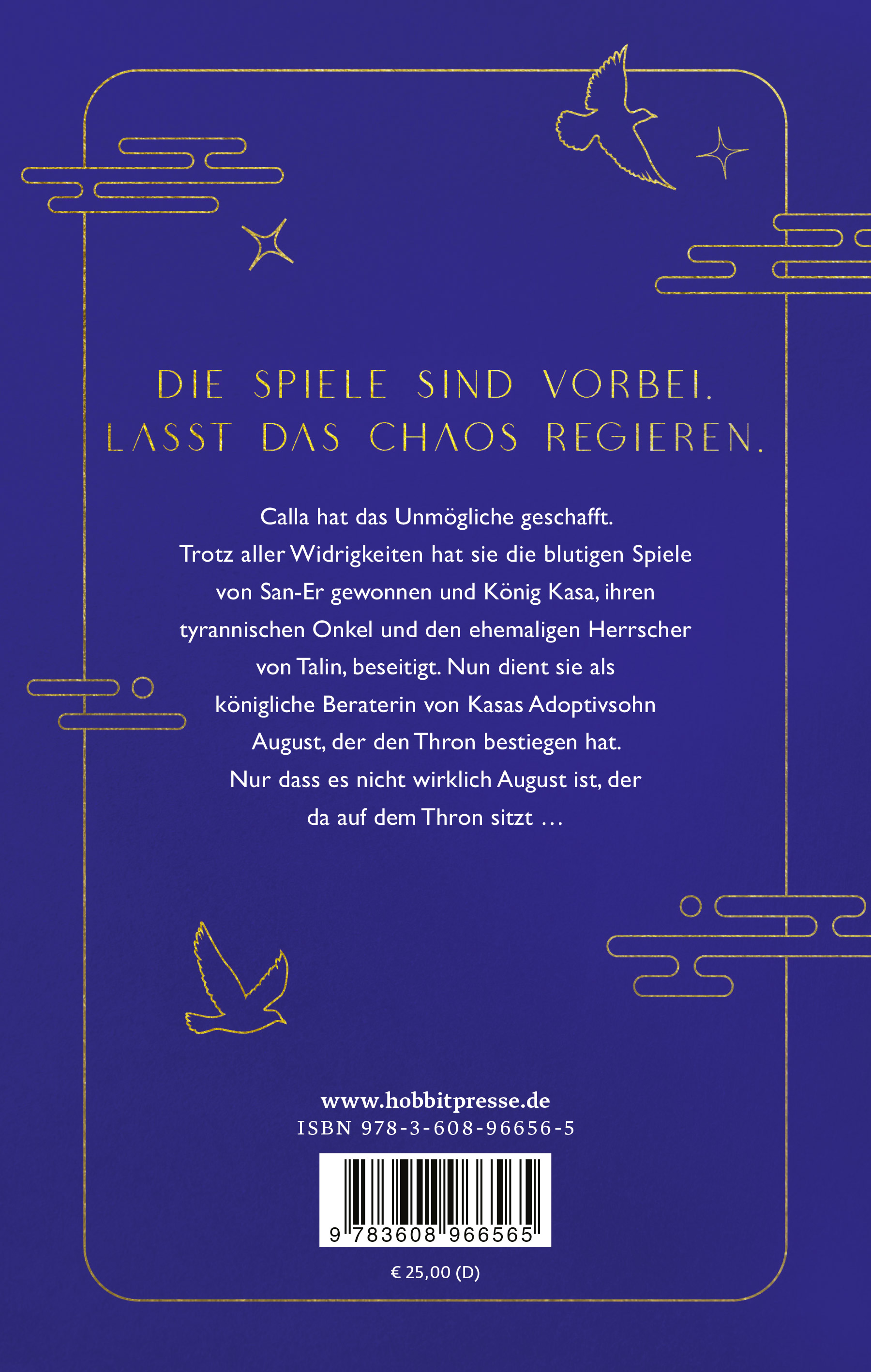 Calla hat das Unmögliche geschafft. Trotz aller Widrigkeiten hat sie die blutigen Spiele von San-Er gewonnen und König Kasa, ihren tyrannischen Onkel und den ehemaligen Herrscher von Talin, beseitigt. Nun dient sie als königliche Beraterin von Kasas Adoptivsohn August, der den Thron bestiegen hat. Nur dass es nicht wirklich August ist, der da auf dem Thron sitzt...