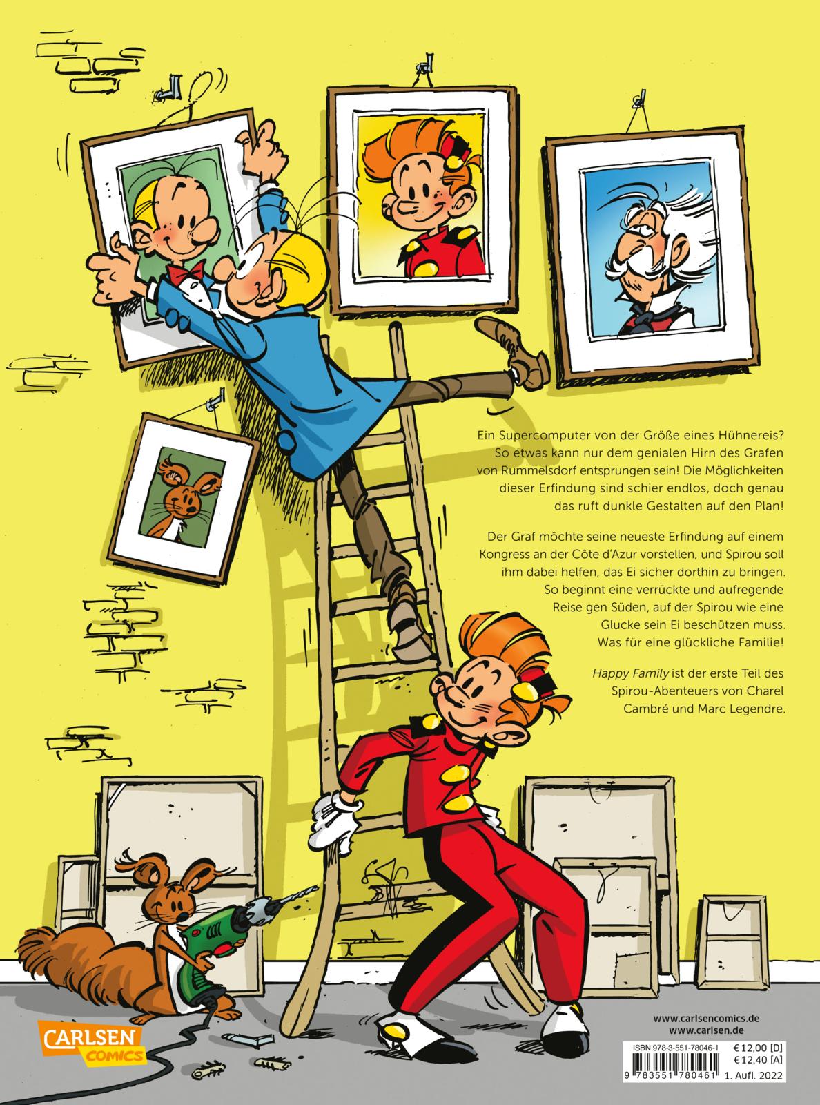 Der Graf möchte seine neueste Erfindung auf einem Kongress an der Cote d'Azur vorstellen, und Spirou soll ihm dabei helfen, das Ei sicher dorthin zu bringen. So beginnt eine verrückte und aufregende Reise nach Süden, auf der Spirou wie eine Glucke sein Ei beschützen muss. Was für eine glückliche Familie das ist!