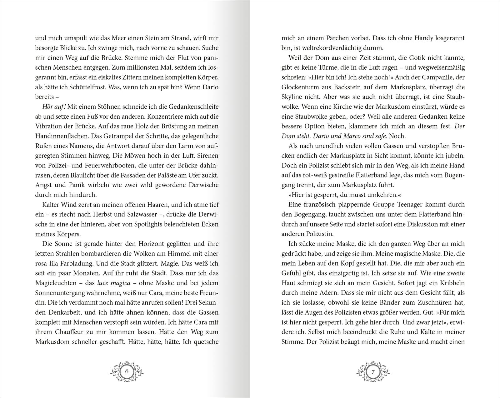 Willkommen an Venedigs magischer Akademie! Ein prachtvoller Palazzo, Geheimgänge, altehrwürdige Bibliotheken und traumhafte Maskenbälle – Anolas neue Schule in Venedig ist atemberaubend schön. Doch die traditionsreiche Akademie hütet ein Geheimnis: An ihr wird die Magie der Masken gelehrt. Als Anola erfährt, dass auch sie eine Maskenmagierin ist, steht ihre Welt Kopf. Wie soll sie nur lernen, ihre neuen Fähigkeiten zu beherrschen? Ihr Halbbruder Marco ist keine Hilfe. Dann ereilen Anola plötzlich schreckliche Visionen. Ganz Venedig ist in Gefahr! Um den magischen Schutzkreis der Stadt zu retten, muss sie wider Willen mit Marco zusammenarbeiten. Und mit seinem besten Freund Dario, der Anolas Herz schneller schlagen lässt ... Eine magische Academy, Maskenbälle, forbidden love und dunkle Gefahren – der fesselnde Auftakt des Urban Romantasy-Abenteuers von Mela Nagel | Mit transparentem Page Overlay