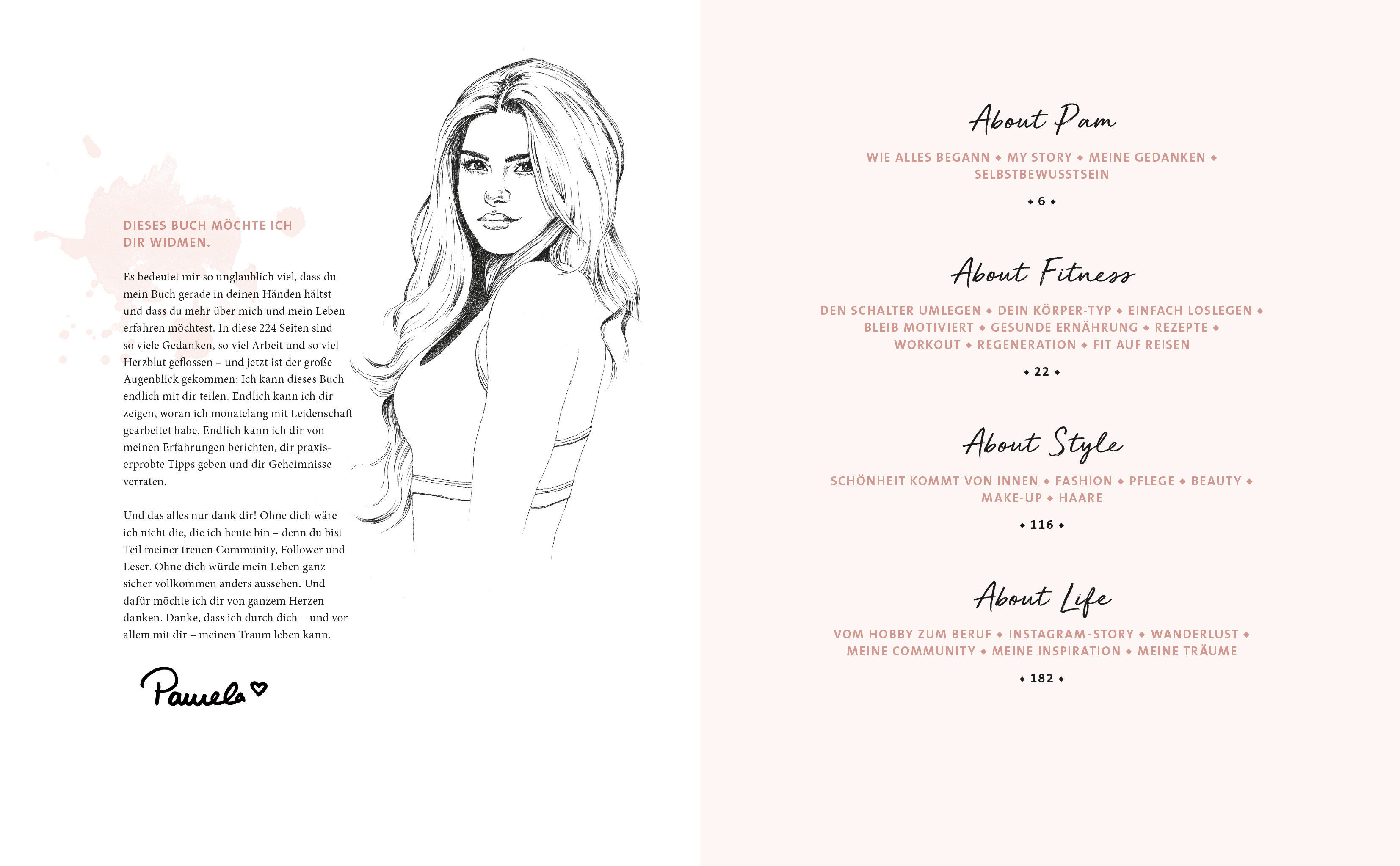 Schönheit kommt für Pamela von Innen und Außen. Wer Make-Up genauso liebt wie sie, wird die Beauty Hacks lieben. Pamela setzt wie bei ihrer Ernährung auch bei der Pflege auf natürliche Inhaltsstoffe wie Kokosöl. Wie Pamela ihre Rundungen perfekt in Szene setzt, zeigt sie in dem Kapitel zum Thema Fashion. Sie liebt die Kombination aus sportlich und elegant: Tagsüber Sneaker, abends High Heels! Für ihre Fans schreibt Pamela auch über ihre persönliche Geschichte und wieso sie sich trotz perfekter Noten für die Karriere als Social Media Star entschied. In ihrem Buch berichtet sie von ihrem Alltag und ihren vielen Reisen und gibt Tipps, wie man sich für Instagram-Fotos perfekt in Szene setzt. Eigens für das Buch wurden viele Bilder in den USA geshootet.