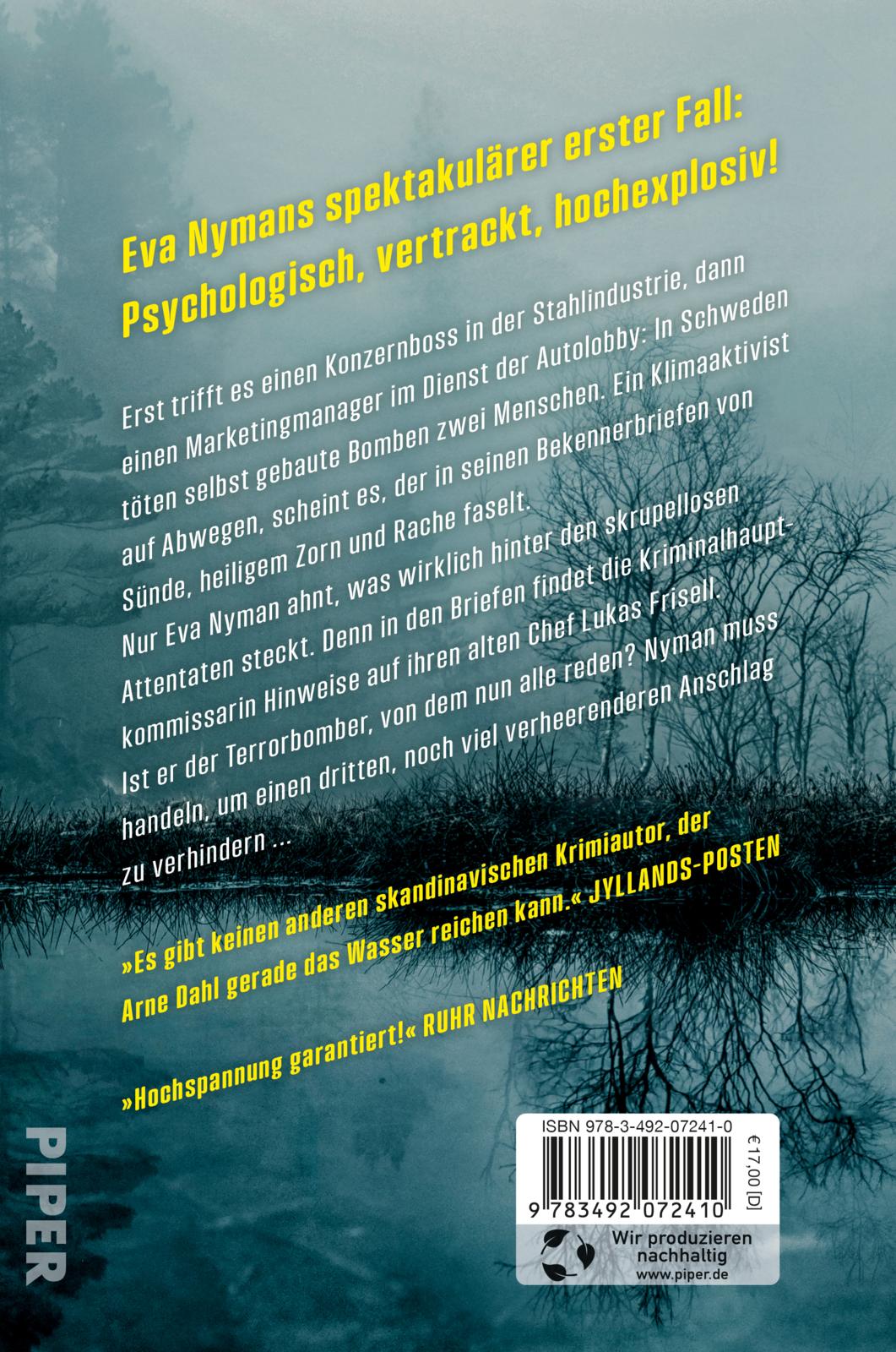 Erst trifft es einen Konzernboss in der Stahlindustrie, dann einen Marketingmanager im Dienst der Autolobby: In Schweden töten selbst gebaute Bomben zwei Menschen, bevor der Attentäter Kontakt mit der Polizei aufnimmt – und mit mehr droht. Ein Klimaaktivist auf Abwegen, scheint es, der in seinen Briefen von Sünde, heiligem Zorn und Rache faselt.