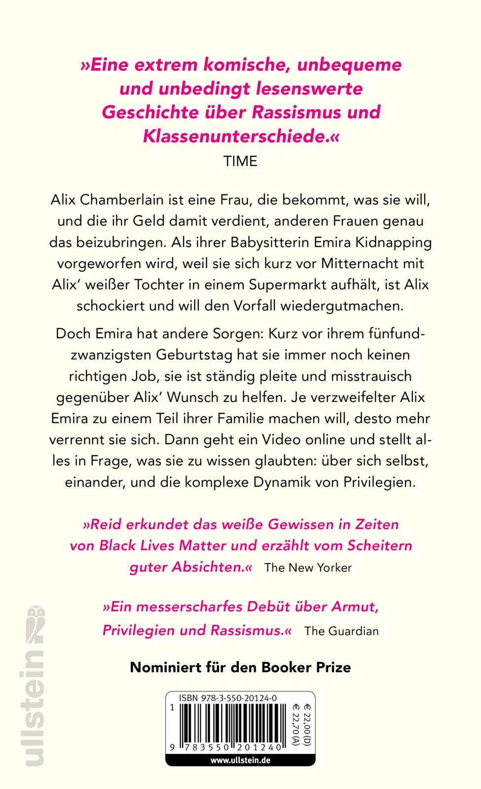Alix Chamberlain ist eine Frau, die bekommt, was sie will, und die ihr Geld damit verdient, anderen Frauen genau das beizubringen. Als ihrer Babysitterin Emira Kidnapping vorgeworfen wird, weil sie sich kurz vor Mitternacht mit Alix‘ weißer Tochter in einem Supermarkt aufhält, ist Alix schockiert und will den Vorfall wiedergutmachen.