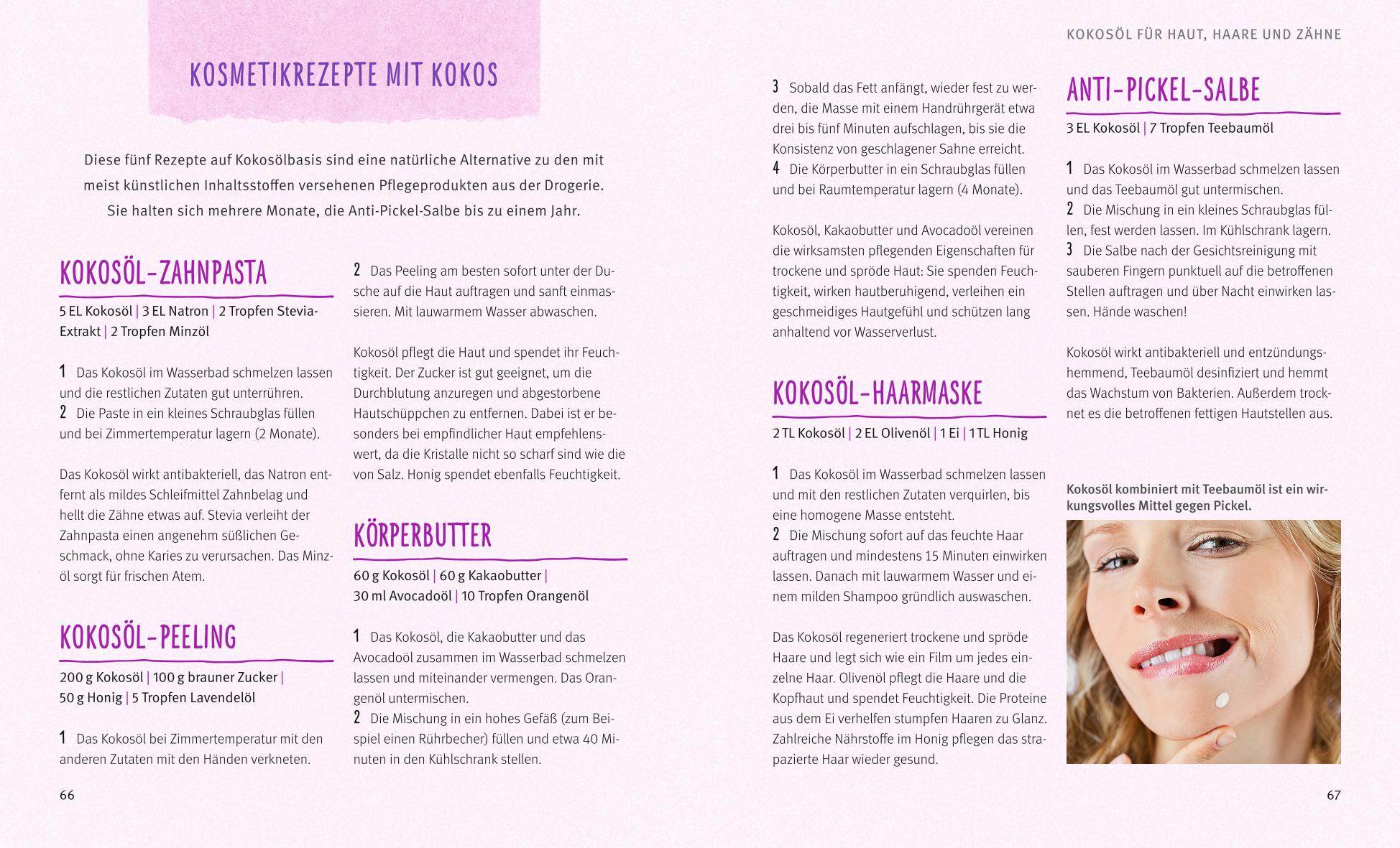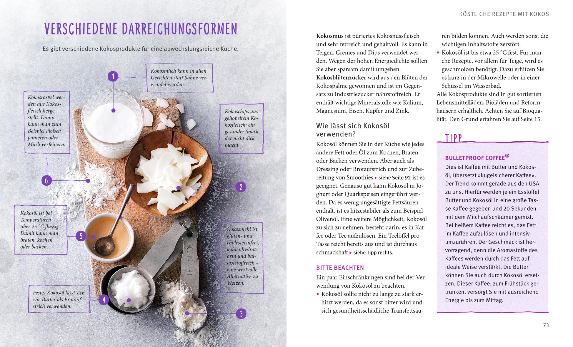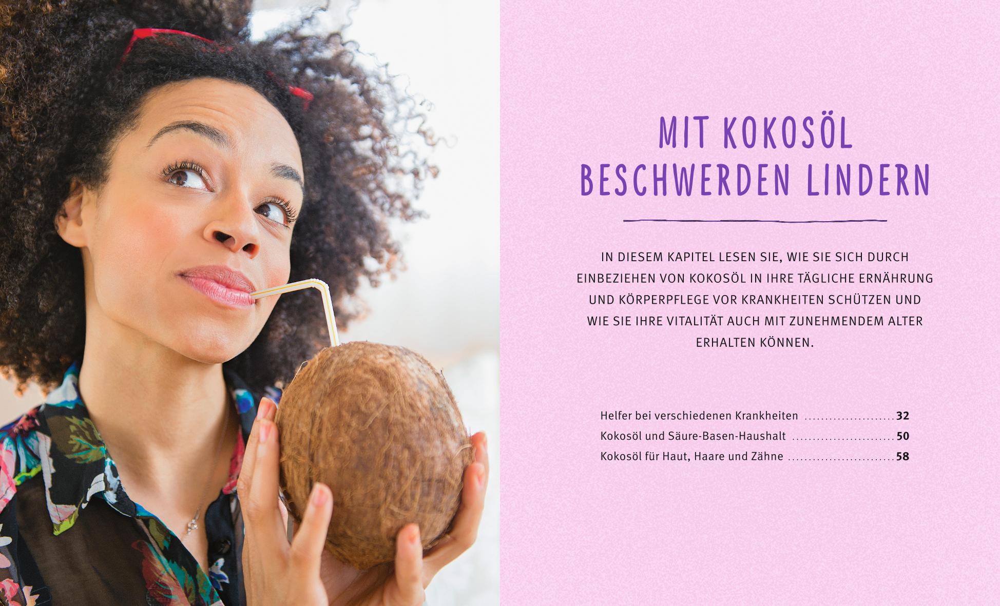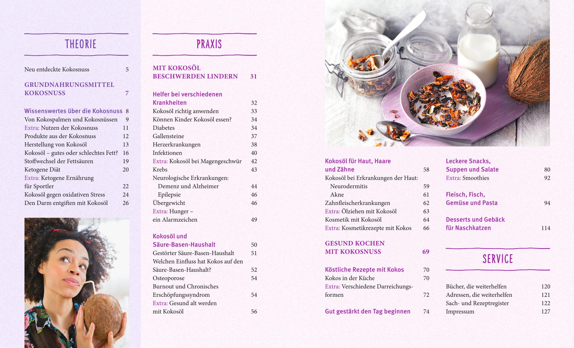 Das 1. Kapitel beschreibt die eindrucksvolle Nährstoffpalette der Kokosnuss, ihre Wirkungsweise und die unterschiedlichen Darreichungsformen. Im 2. Kapitel wird der Einsatz der Kokosnuss bei chronischen Beschwerden beschrieben. Im abschließenden 3. Kapitel werden leckere Rezepte der ketogenen Ernährung vorgestellt. Schön bebilderte Sonderseiten liefern Informationen zur Ölziehkur mit Kokosöl, zum Herstellen von Hautpflegemitteln und zu Smoothies.