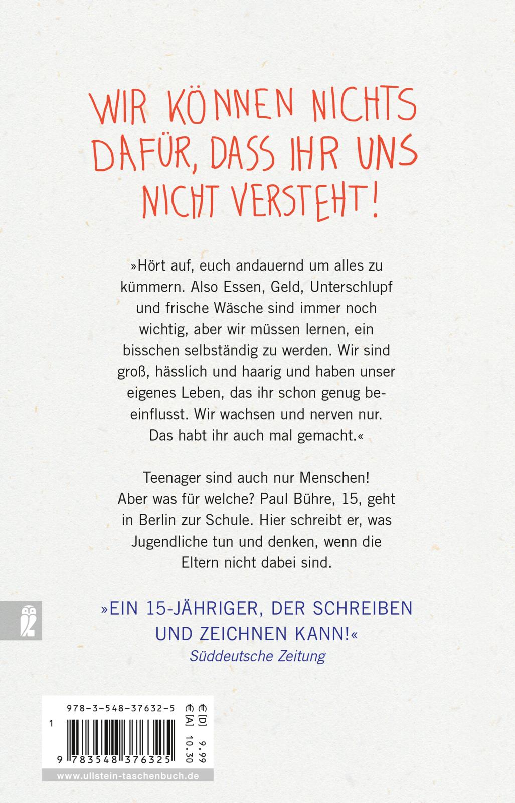 „Hört auf, euch andauernd um alles zu kümmern. Also Essen, Geld, Unterschlupf und frische Wäsche sind immer noch wichtig, aber wir müssen lernen, ein bisschen selbständig zu werden. Wir sind groß, hässlich und haarig und haben unser eigenes Leben, das ihr schon genug beeinflusst. Wir wachsen und nerven nur. Das habt ihr auch mal gemacht.“ Teenager sind auch nur Menschen! Aber was für welche? Paul Bühre, 15, geht in Berlin zur Schule. Hier schreibt er, was Jugendliche tun und denken, wenn die Eltern nicht dabei sind.