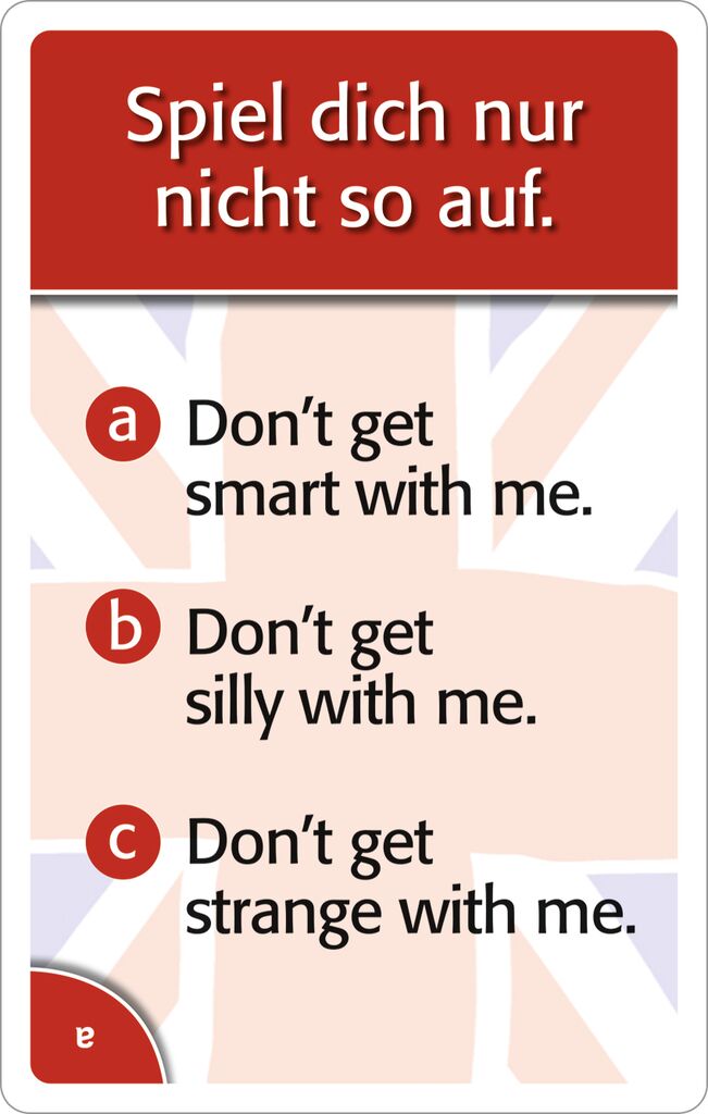 All good things are three. Können Sie ahnen, was das wohl heißt? Oder sind Sie auf dem wood way? Noch nie war es lustiger, englische Redewendungen zu lernen, als mit den 75 denglischen Sprüchen in der dritten Edition unserer Denglisch-Quizze. Ob alleine oder im Team, Karte für Karte testen die Spieler, ob ihre Englischkenntnisse das Gelbe vom Ei sind - Lachanfall inklusive.