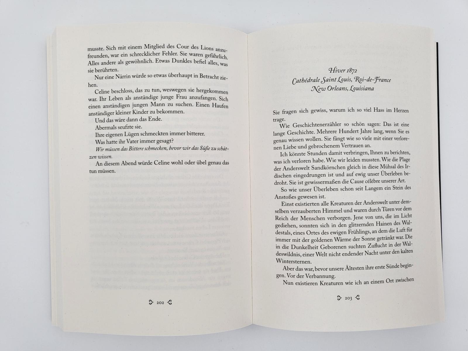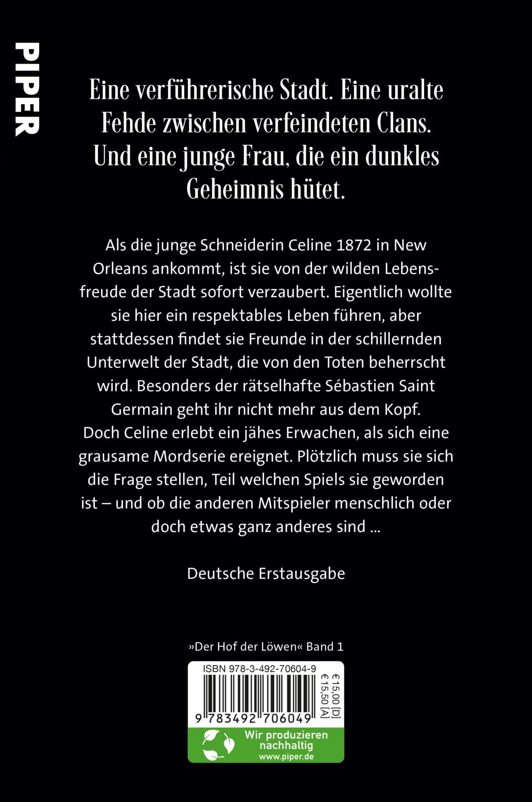 Als die junge Schneiderin Celine 1872 in New Orleans ankommt, ist sie von der wilden Lebensfreude der Stadt sofort verzaubert. Eigentlich wollte sie hier ein respektables Leben führen, aber Freunde findet sie stattdessen in der schillernden Unterwelt der Stadt, die von den Toten beherrscht wird. Besonders der rätselhafte Sébastien Saint Germain geht ihr nicht mehr aus dem Kopf. Doch Celine erlebt ein jähes Erwachen, als sich eine grausame Mordserie ereignet. Plötzlich muss sie sich die Frage stellen, Teil welchen Spiels sie geworden ist – und ob die anderen Mitspieler menschlich oder doch etwas ganz anderes sind …