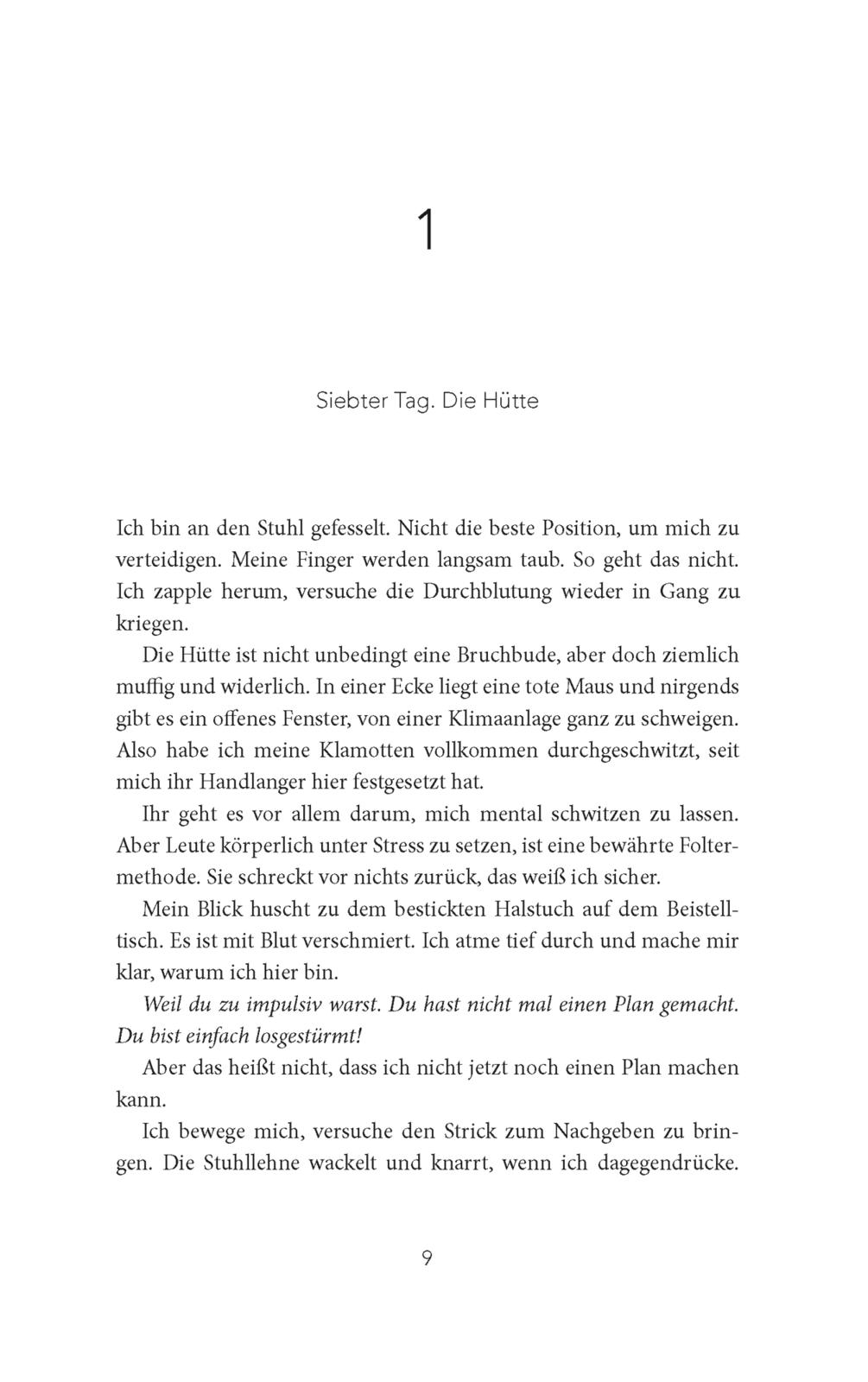 - Beschreibung Die Highschool ist geschafft, aber Noras Zukunft sieht düster aus: Ihr Stiefvater Raymond wurde aus der Haft entlassen und hat sie im Visier. Darum ist Nora fest entschlossen, ihren (vielleicht letzten) Sommer zu genießen. Sie plant eine mehrtägige Rucksacktour mit Iris und Wes. Zwar klinkt sich spontan Wes' Freundin ein, doch Amanda ist cool, also ist es keine große Sache – bis sie entführt wird. Besser gesagt, bis sie mit Nora verwechselt wird. Jetzt hat Raymond eine Geisel. Und Nora, Iris und Wes müssen ihr ganzes Können aufbieten, um es lebend – und mit Amanda – aus dem Wald zu schaffen.