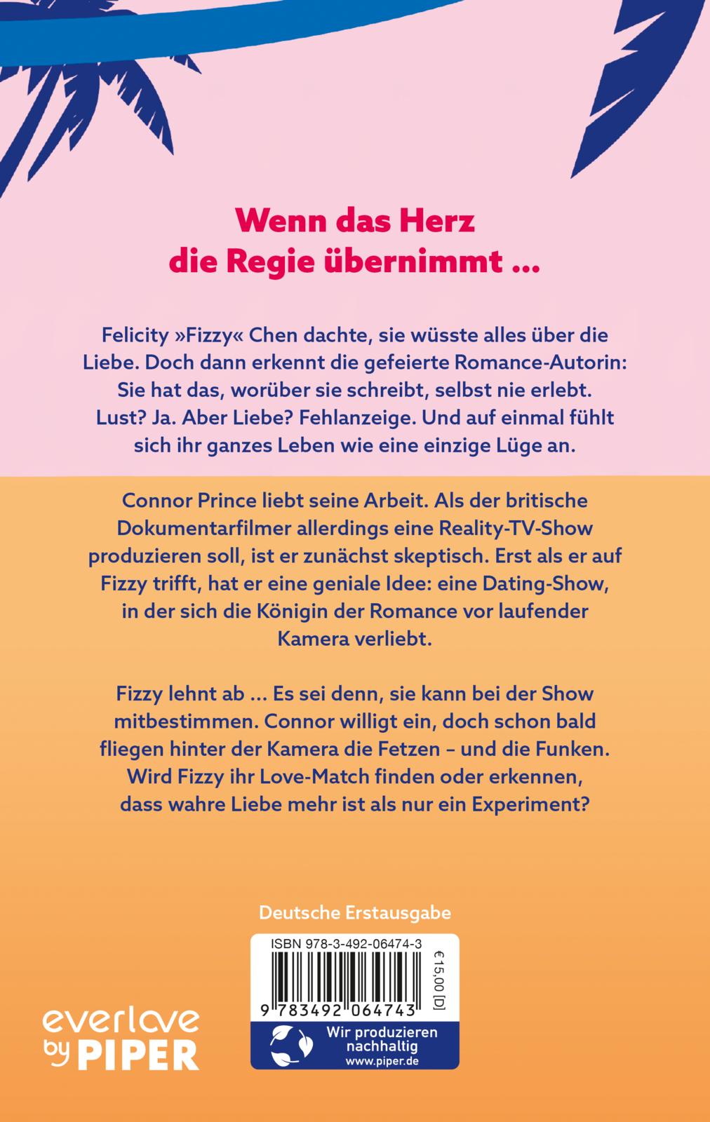 Fizzy Chen glaubt, alles über die Liebe zu wissen. Doch dann wird der Romance-Bestsellerautorin klar: Sie hat das, worüber sie schreibt, nie selbst erlebt. Plötzlich fühlt sich ihr Leben wie eine Lüge an, und sie lässt sich auf ein ungewöhnliches Abenteuer ein: eine Dating-Show, in der sich die Königin der Romance verliebt – vor laufender Kamera. Doch dann lernt Fizzy den mürrischen Produzenten Connor kennen und fragt sich, ob sie ihren Mr Right tatsächlich vor der Kamera finden wird.