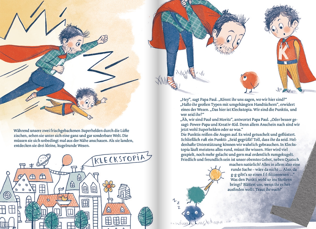 - Superhelden-Bilderbuchgeschichte „Power-Papa und Kreativ-Kid“: Ein Wendecover offenbart eine inspirierende Geschichte zum gemeinsamen Lesen, die Vater und Kind in die magische Welt von Kleckstopia entführt.