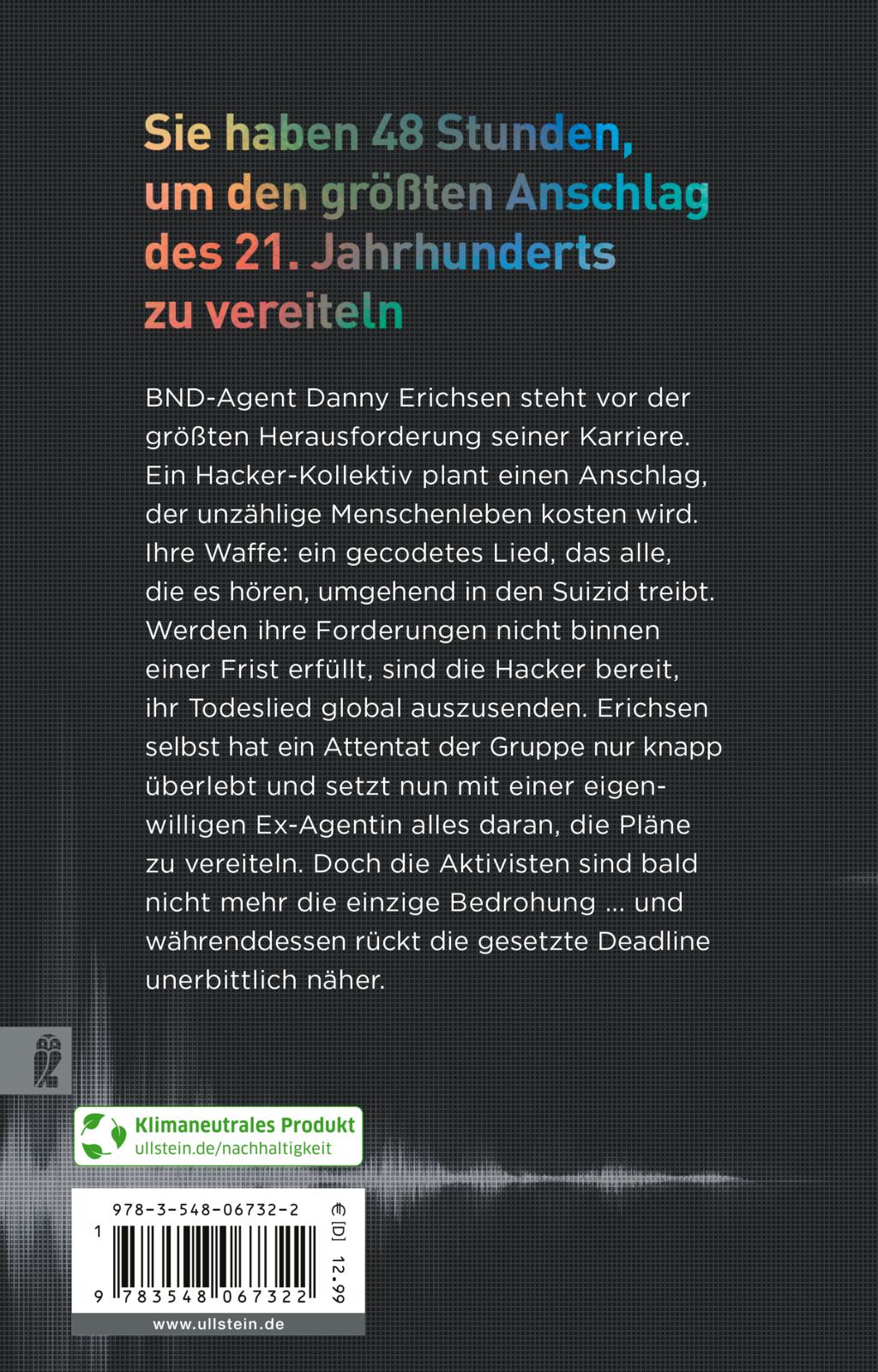 Ein Hacker-Kollektiv, das sich im Kampf gegen den Klimawandel radikalisiert hat, plant einen fatalen Angriff, der viele Menschenleben kosten wird. Ihre Waffe: ein gecodetes Lied, das alle, die es hören, umgehend in den Suizid treibt. Werden ihre Forderungen nicht binnen einer Frist erfüllt, sind die Hacker bereit, ihr Todeslied global auszusenden. BND-Agent Danny Erichsen, der selbst ein Attentat der Gruppe nur knapp überlebt hat, macht Jagd auf die Strippenzieher. Ihm wird eine eigenwillige Ex-Agentin zur Seite gestellt, die bei einem Einsatz vor vielen Jahren ihr Gehör verloren hat. Doch bald ist die Hackergruppe nicht der einzige Gegenspieler der Agenten ... und die gesetzte Deadline rückt immer näher.