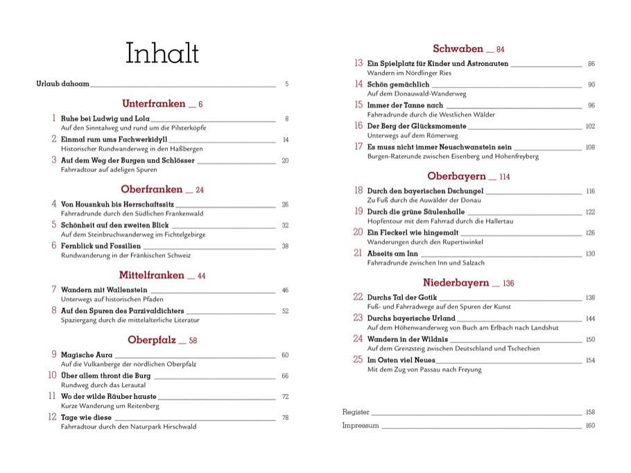 Urlaub daheim ist angesagt! Aber natürlich nicht dort, wo alle sind – sondern an versteckten Geheimplätzen. Es muss ja nicht immer Neuschwanstein sein, das Allgäu ist reich an Schlössern und Burgen. Und während anderswo die Menschen gegen Massentourismus demonstrieren, verlieren sich die Ausflügler in den Weiten der Oberpfalz. Und auch Campen ist in Bayern stilvoll und mit viel Platz möglich. Lassen Sie sich von unseren Urlaubsideen inspirieren! Für den perfekten Urlaub in Bayern: Vorschläge für Wander- und Radtouren sowie Ausflugstipps dorthin, wo es daheim am schönsten ist.