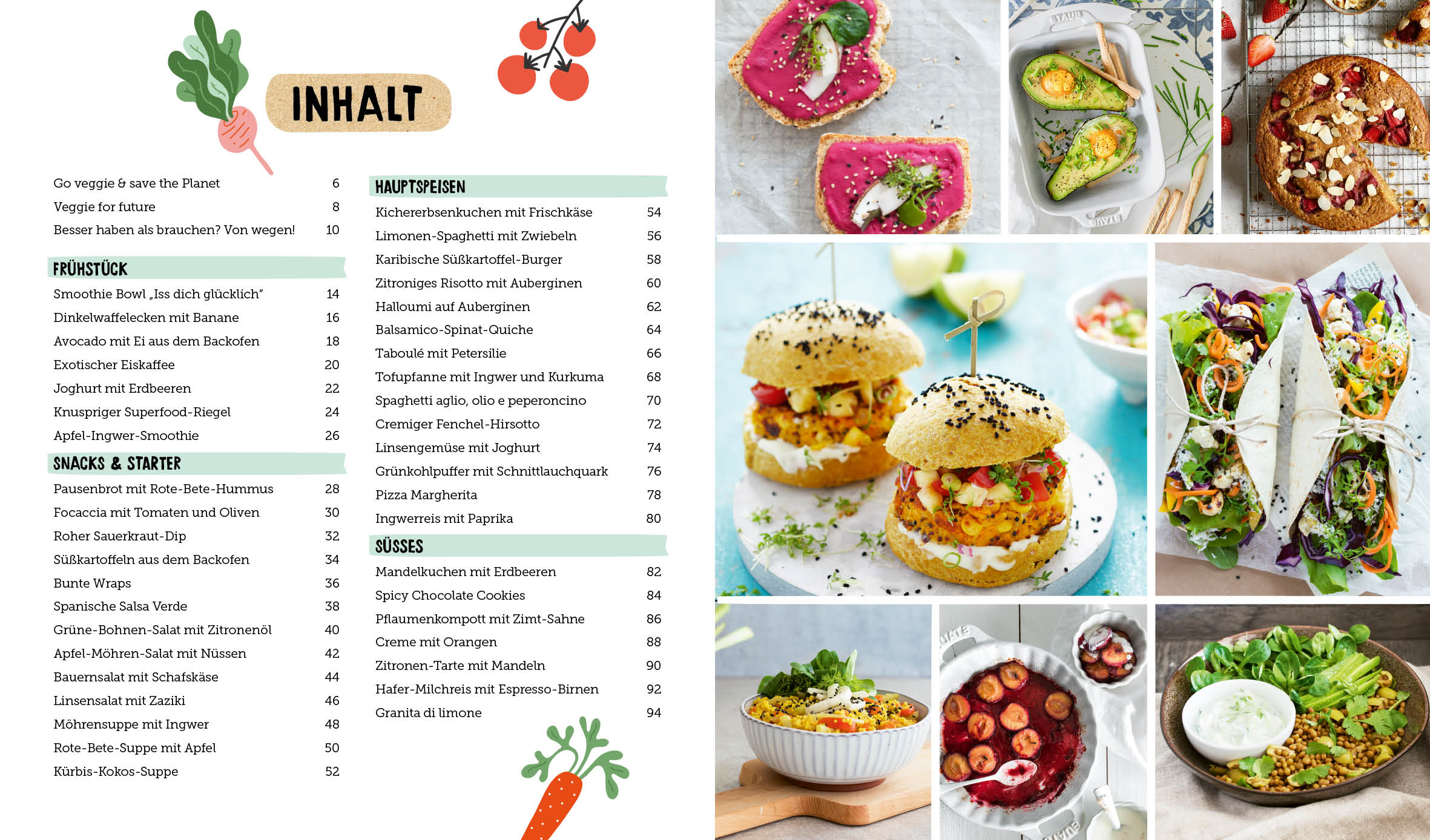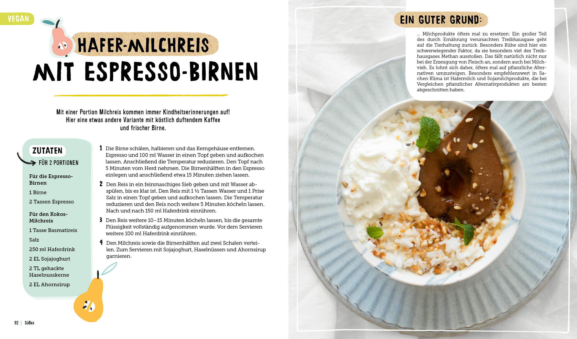Mit den 40 Rezepten bekommt man eine fantastische Auswahl an vegetarischen Gerichten, die alles andere als Hasenfutter sind: Zitroniges Risotto mit Auberginen, Apfel-Möhren-Salat mit Nüssen oder Hafermilchreis mit Espresso-Birnen sind nur ein kleiner Vorgeschmack auf das, was dich erwartet. So kann man lecker essen und ganz nebenbei Uns, die Umwelt und unseren Planeten retten.