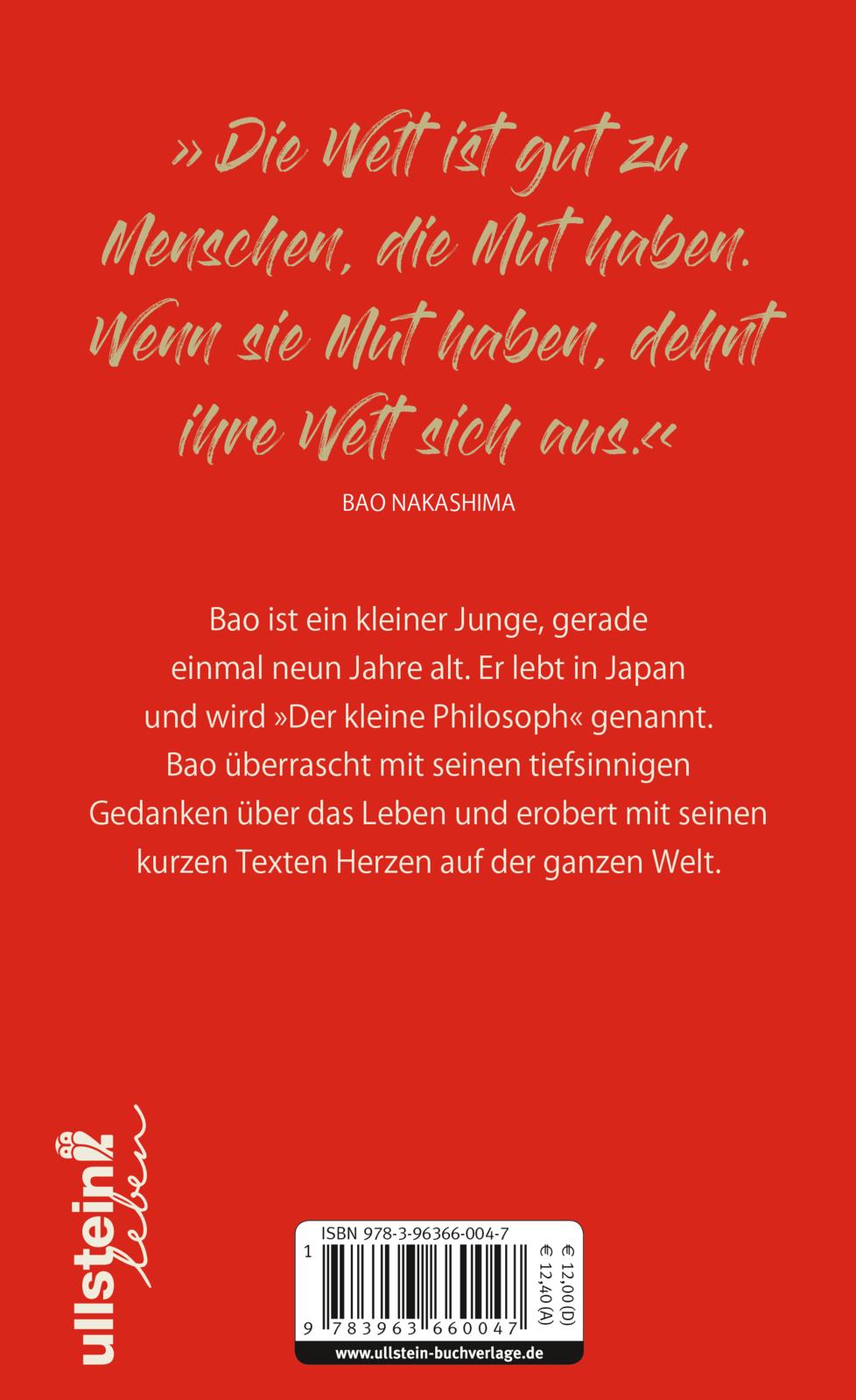 Bao ist neun und denkt viel über das Leben nach. Und so beginnt er, seine Gedanken aufzuschreiben. Es sind elementare Fragen über das, was ihm im Leben wichtig ist. Daraus entstand diese einzigartige Sammlung an kurzen Texten, mit denen der kleine Philosoph die Herzen vieler Leser bereits im Sturm erobert hat.
