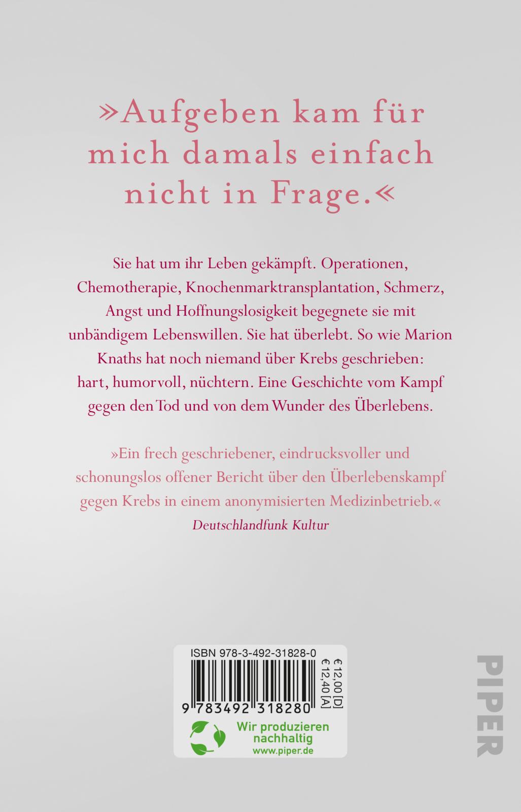 Sie hat um ihr Leben gekämpft. Operationen, Chemotherapie, Knochenmarktransplantation, Schmerz, Angst und Hoffnungslosigkeit begegnete sie mit unbändigem Lebenswillen. Sie hat überlebt. So wie Marion Knaths hat noch niemand über Krebs geschrieben: hart, humorvoll, nüchtern. Eine Geschichte vom Kampf gegen den Tod und von dem Wunder des Überlebens.