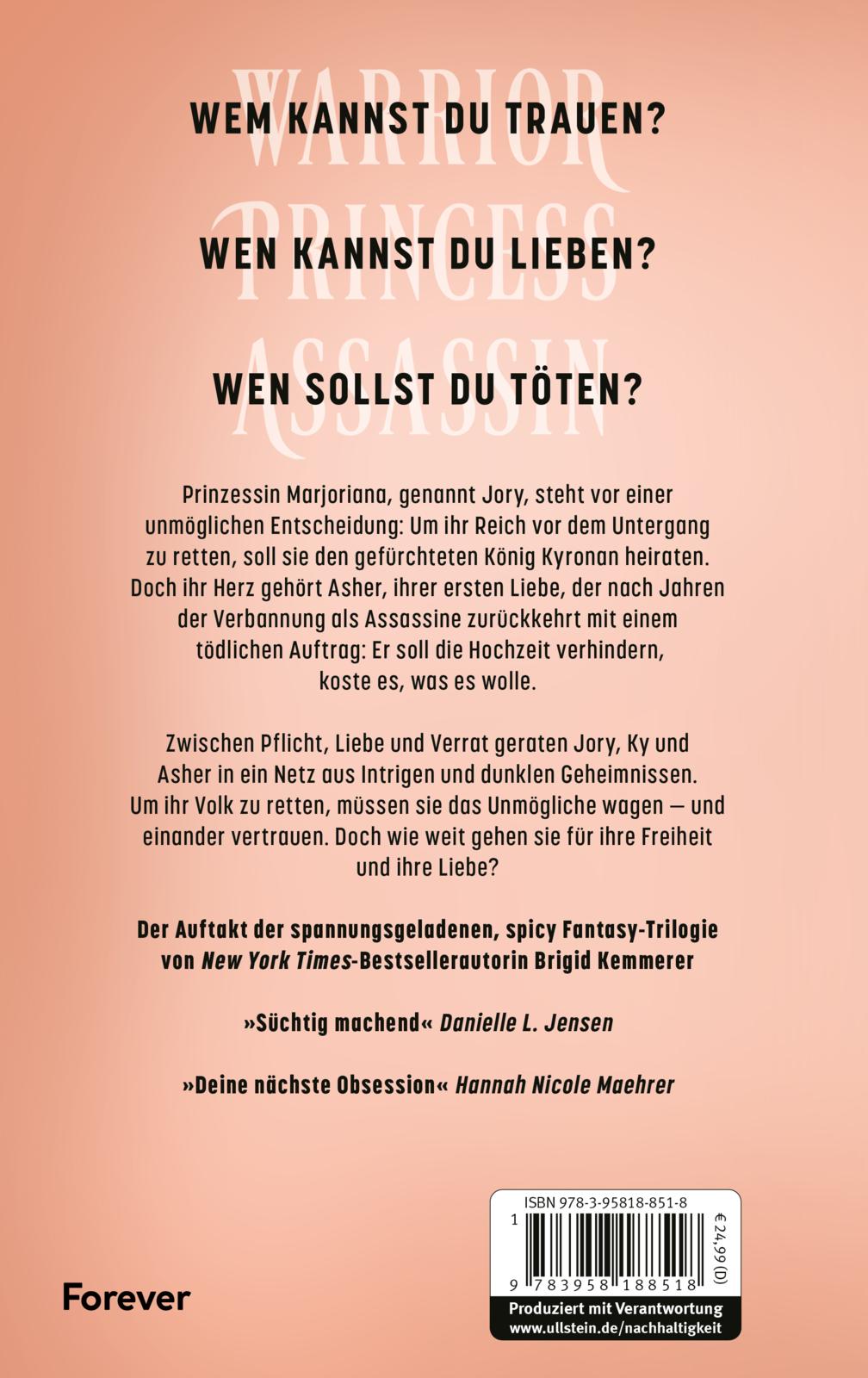 Prinzessin Marjoriana, genannt Jory, steht vor einer unmöglichen Entscheidung: Um ihr Reich vor dem Untergang zu retten, soll sie den gefürchteten König Kyronan heiraten. Doch ihr Herz gehört Asher, ihrer ersten Liebe, der nach Jahren der Verbannung als Assassine zurückkehrt – mit einem tödlichen Auftrag: Er soll die Hochzeit verhindern, koste es, was es wolle.