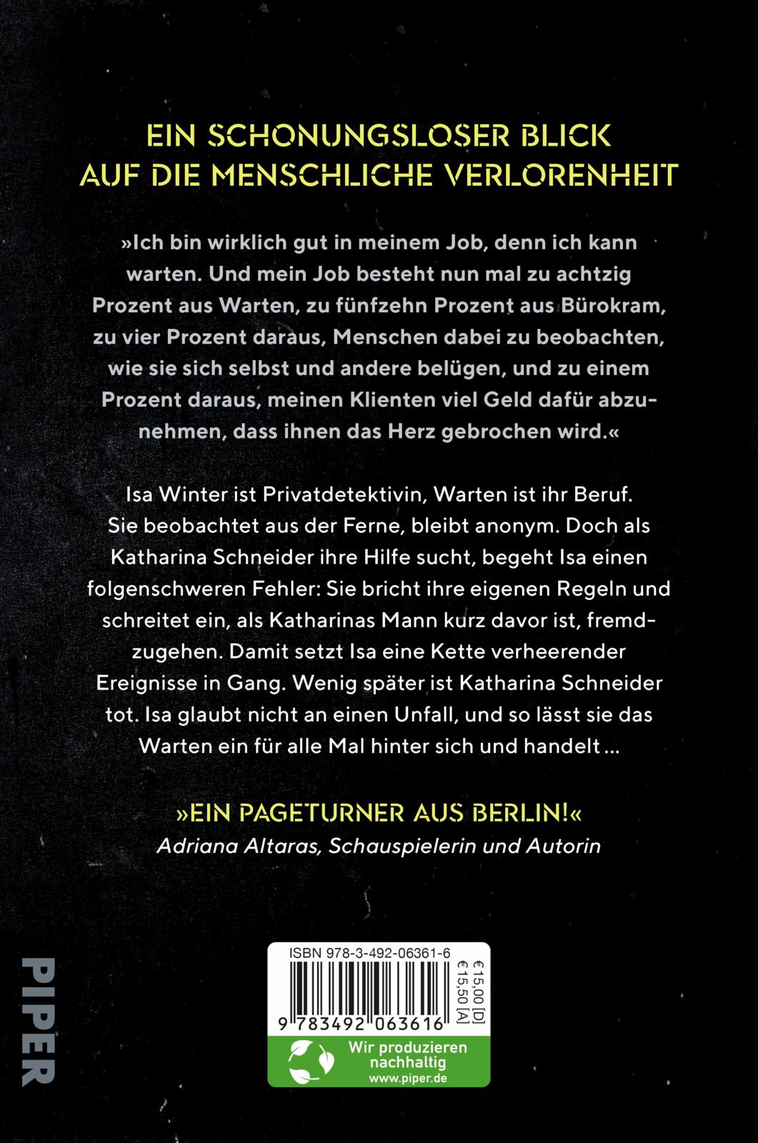 - Beschreibung Isa Winters Beruf ist das Warten. Sie ist Privatdetektivin, eine richtig gute. Sie beobachtet aus der Ferne, bleibt anonym. Doch als Katharina Schneider ihre Hilfe sucht, ändert sich alles. Isa ist so beeindruckt von ihr, dass sie ihre eigenen Regeln bricht: Als Katharinas Mann während einer Observation kurz davor ist fremdzugehen, schreitet Isa ein. Damit setzt sie eine Kette verheerender Ereignisse in Gang, wenig später stürzt Katharina Schneider aus dem Fenster ihrer Wohnung in den Tod. Isa Winter glaubt nicht an einen Unfall, und so beschließt sie, das Warten aufzugeben und zu handeln.